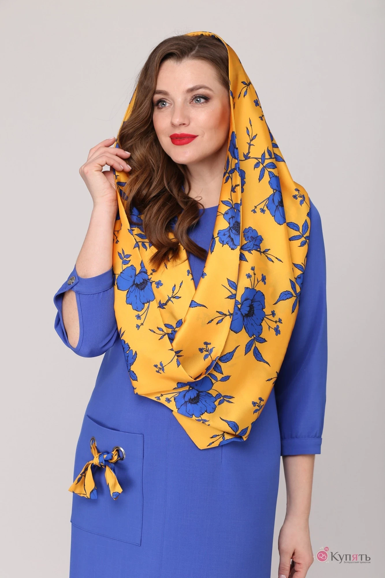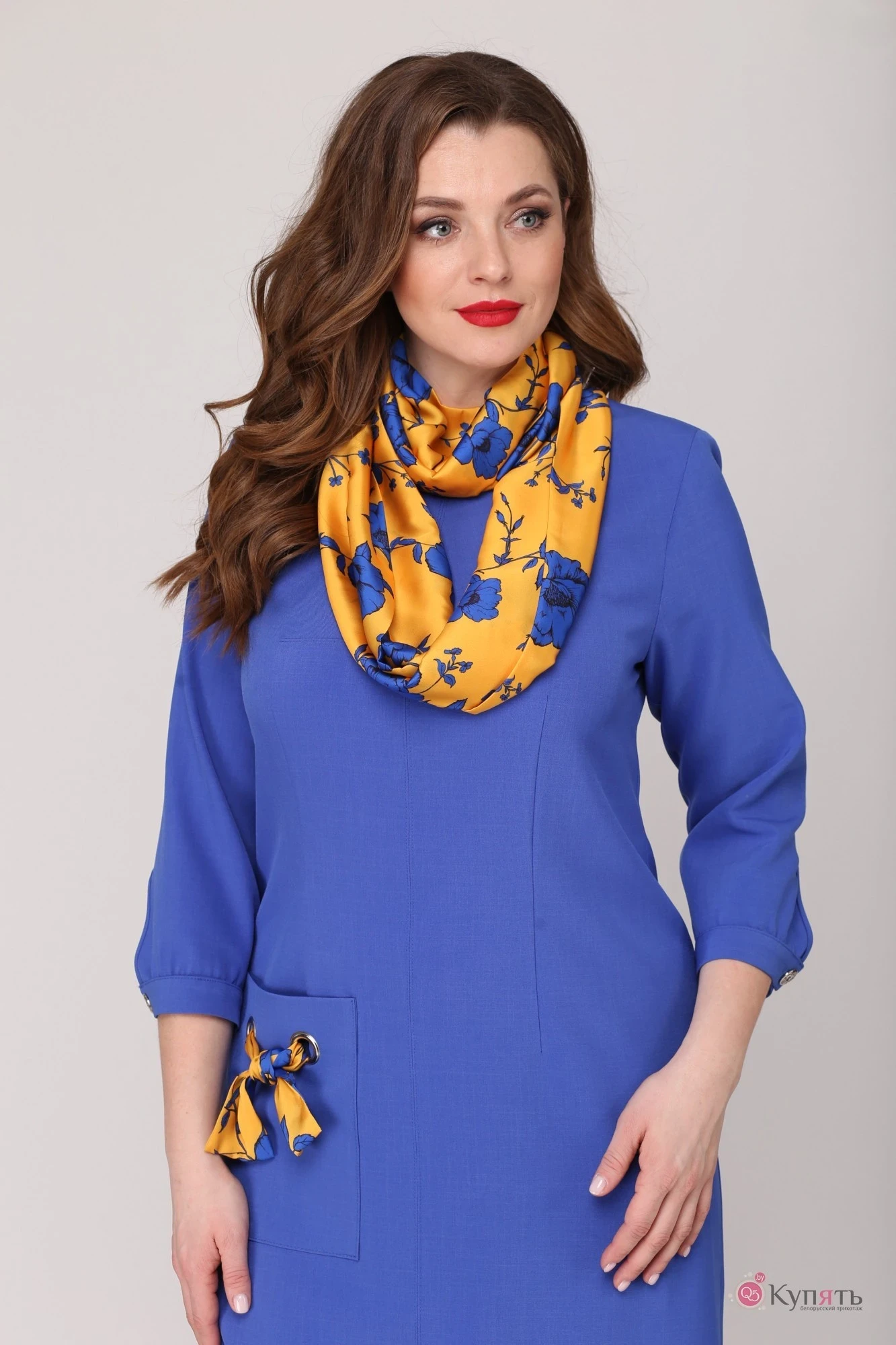 Элегантное платье полуприлегающего силуэта насыщенного цвета приобретает новую жизнь в комплекте с контрастным ярким шарфом-снуд из легкого нежного шёлка. Платье с округлой горловиной, по переду центральный шов с отделочными строчками и горизонтальной вытачкой по линии груди, талиевые вытачки. С правой стороны по линии бедра накладной карман, который служит стильным украшением модели. Спинка с талиевыми вытачками и средним швом со шлицей внизу. В среднем шве спинки расположена потайная застежка на тесьму-молнию. Рукав втачной одношовный, длиной 45 см. Внизу рукава притачная манжета с застежкой на пуговицу, низ рукава слегка присборен , фигурный разрез в виде «капельки» обработан окантовкой. Платье без подкладки.Съемный шарф-снуд позволят моделировать разнообразные образы, фантазируйте и Вы будете обворожительны!
