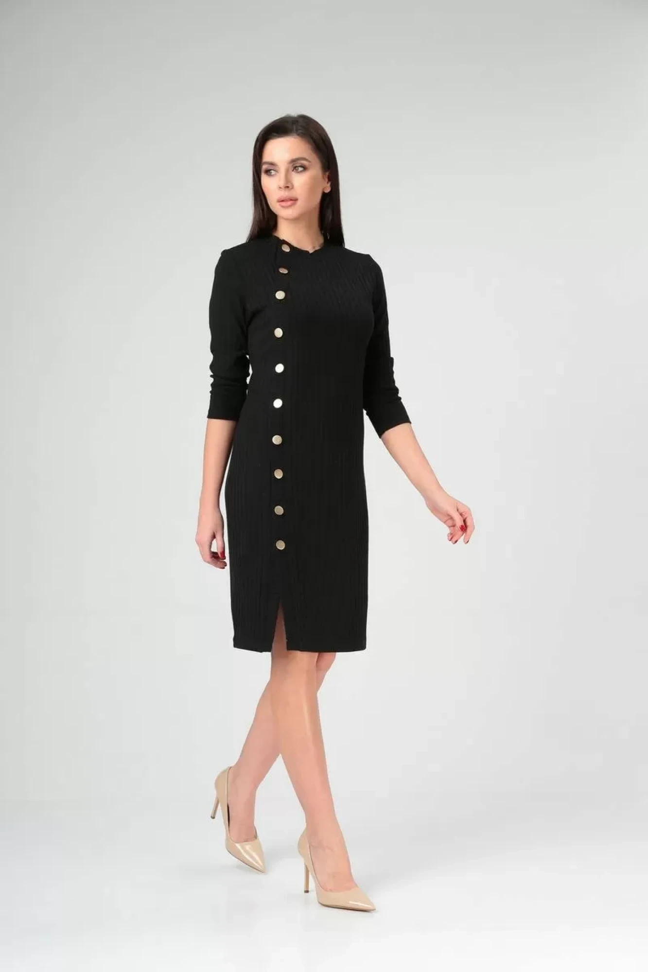 Платье шикарное. По фигуре село отлично. Черный цвет указывает на строгость образа, а разрез и пуговицы придают шарм.