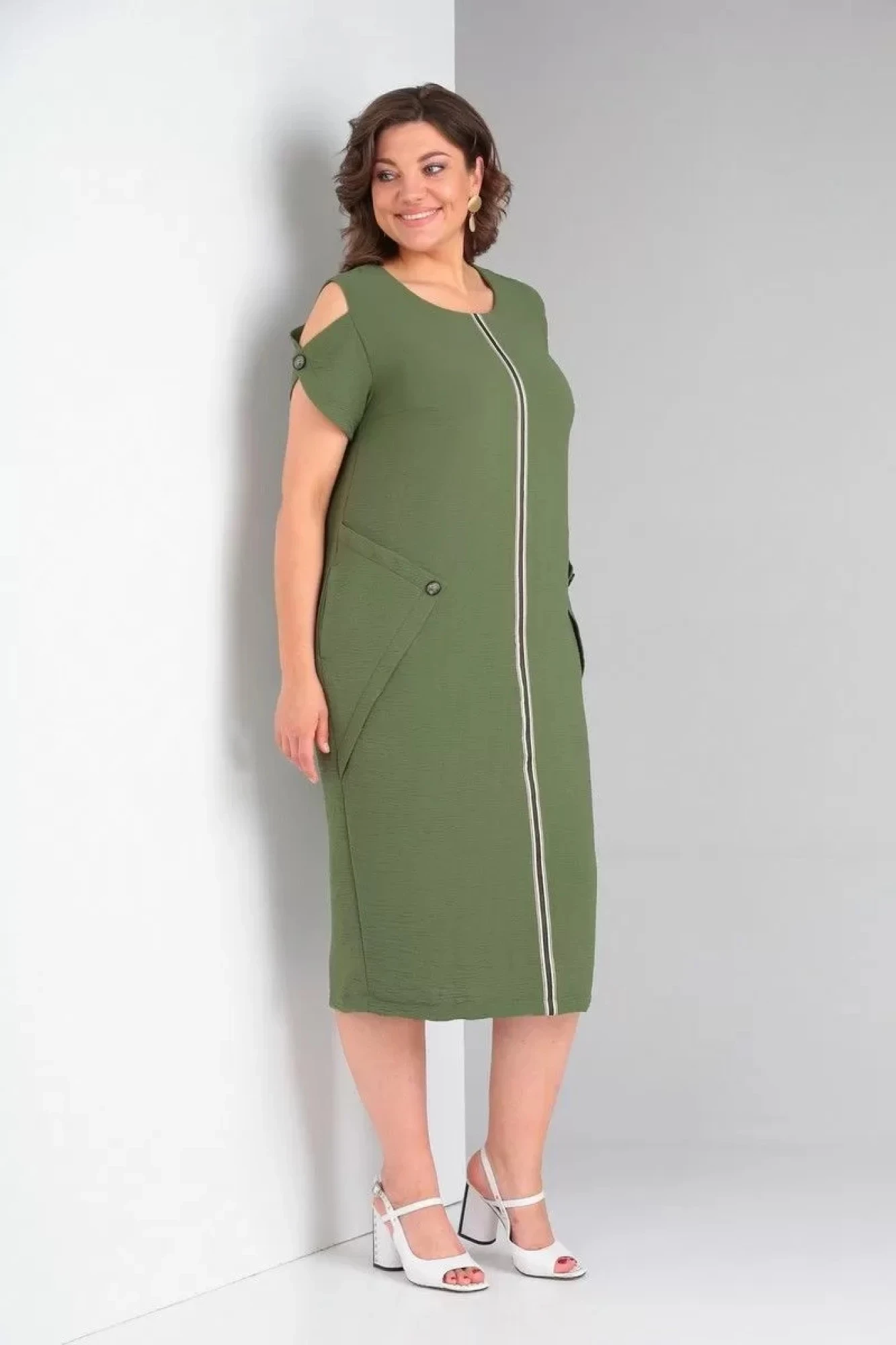 Платье женское полуприлегающего силуэта. Перед с нагрудными вытачками,средним швом, вдоль которого настрочена тесьма. Карманы боковые обработаны в швах. По бокам переда настрочены декоративные детали с пуговицей и отделочными строчками. Спинка со средним швом и разрезом. Горловина V-образной формы. Рукав втачной с иммитацией застёжки(на запах) на пуговицу.