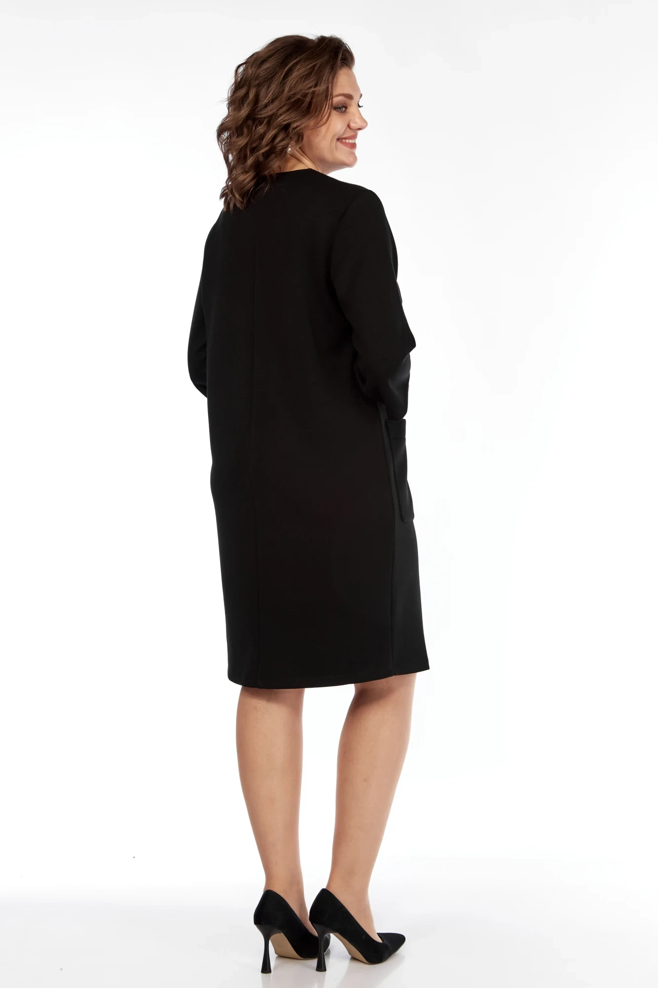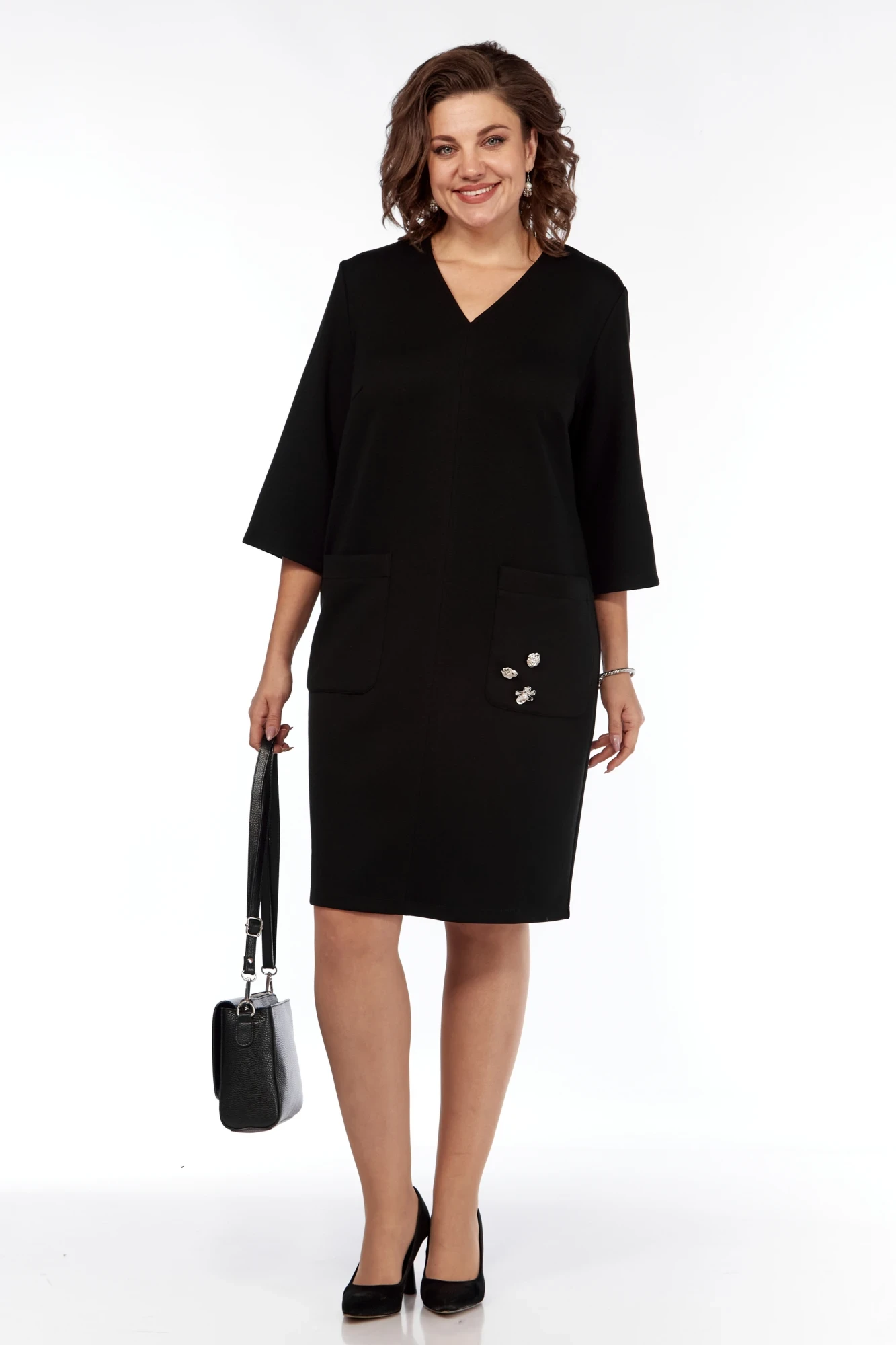 Платье женское полуприлегающего силуэта . Спинка со средним швом. Перед со средним швом и косыми нагрудными вытачками. Карманы боковые накладные округлой формы. Левый карман украшен фурнитурой. Горловина V-образной формы. Рукав втачной одношовный длиной 3/4. По среднему шву переда и горловины отделочная строчка на 0,7 см от шва.