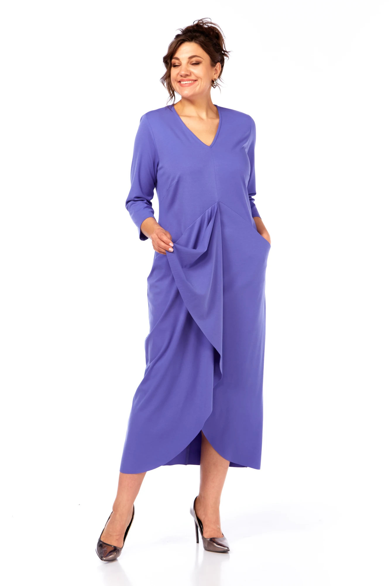 Платье женское полуприлегающего силуэта. Рукав втачной, одношовный, короткий. По переду средний шов, нагрудные вытачки, подрезы к боковым швам. В швах подреза обработаны карманы. Нижняя центральная часть с запахом. Верхняя деталь с свободным кроем. По спинке средний шов.