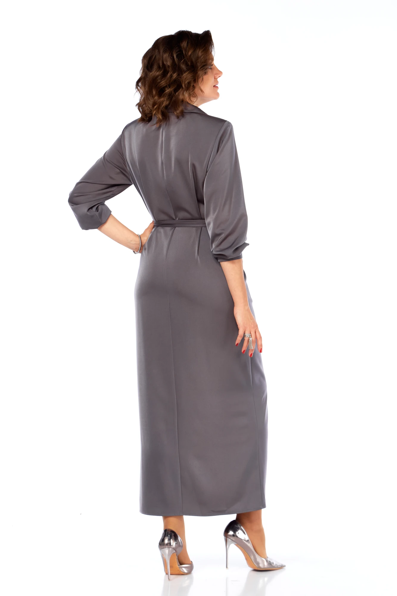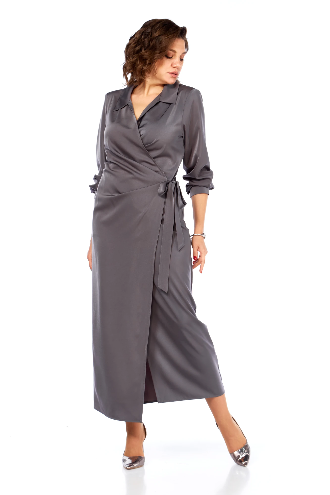 Платье женское длинное с запахом и застежкой на завязку внутри и пояс снаружи. Спинка со средним швом. Перед с тремя легкими складками в области талии. Рукав втачной одношовный с манжетами и двумя мягкими складками. Воротник отложной. Манжеты застегиваются на 2 навесные путли и пуговицы. Фурнитура может отличаться от заявленной на фото.