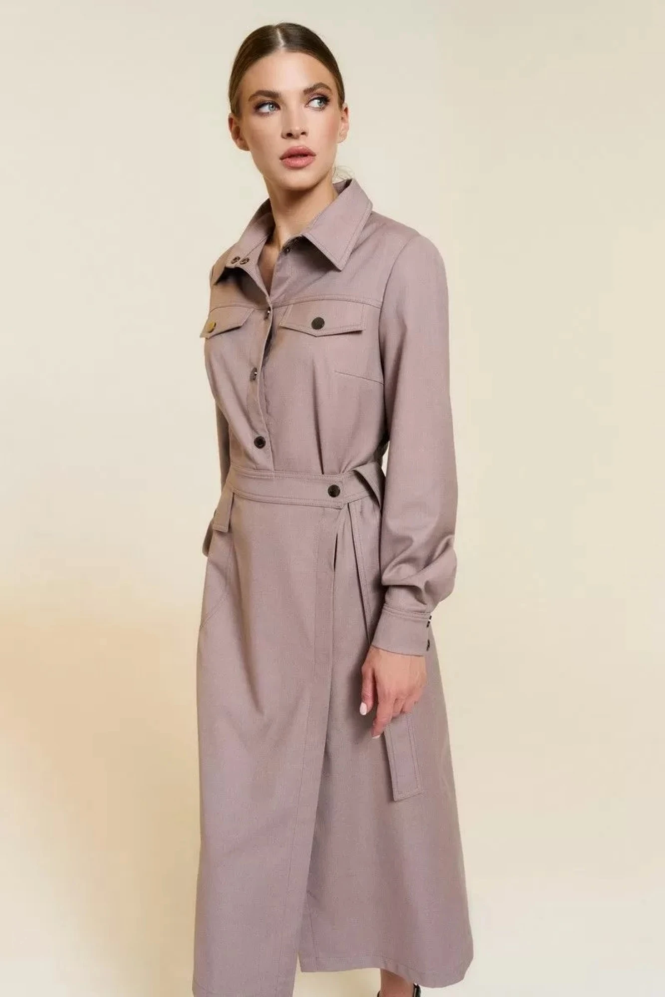 Платье женское полуприлегающего силуэта из ткани платьево-костюмного ассортимента. Перед отрезной по линии талии ассиметричной формы. На лифе отрезные кокетки, в шов притачивания кокеток вставлены клапаны. На лифе застежка по лифу на пробивные кнопки, по юбке на пришивные кнопки. В боковых швах юбки обработаны карманы. По переду юбки с права подрезной бочок полукруглой формы с клапаном. Между лифом и юбкой имитация пояса, переходящего в застежку. Воротник отложной на стойке. Низ платья подшит швом вподгибку с закрытым срезом.