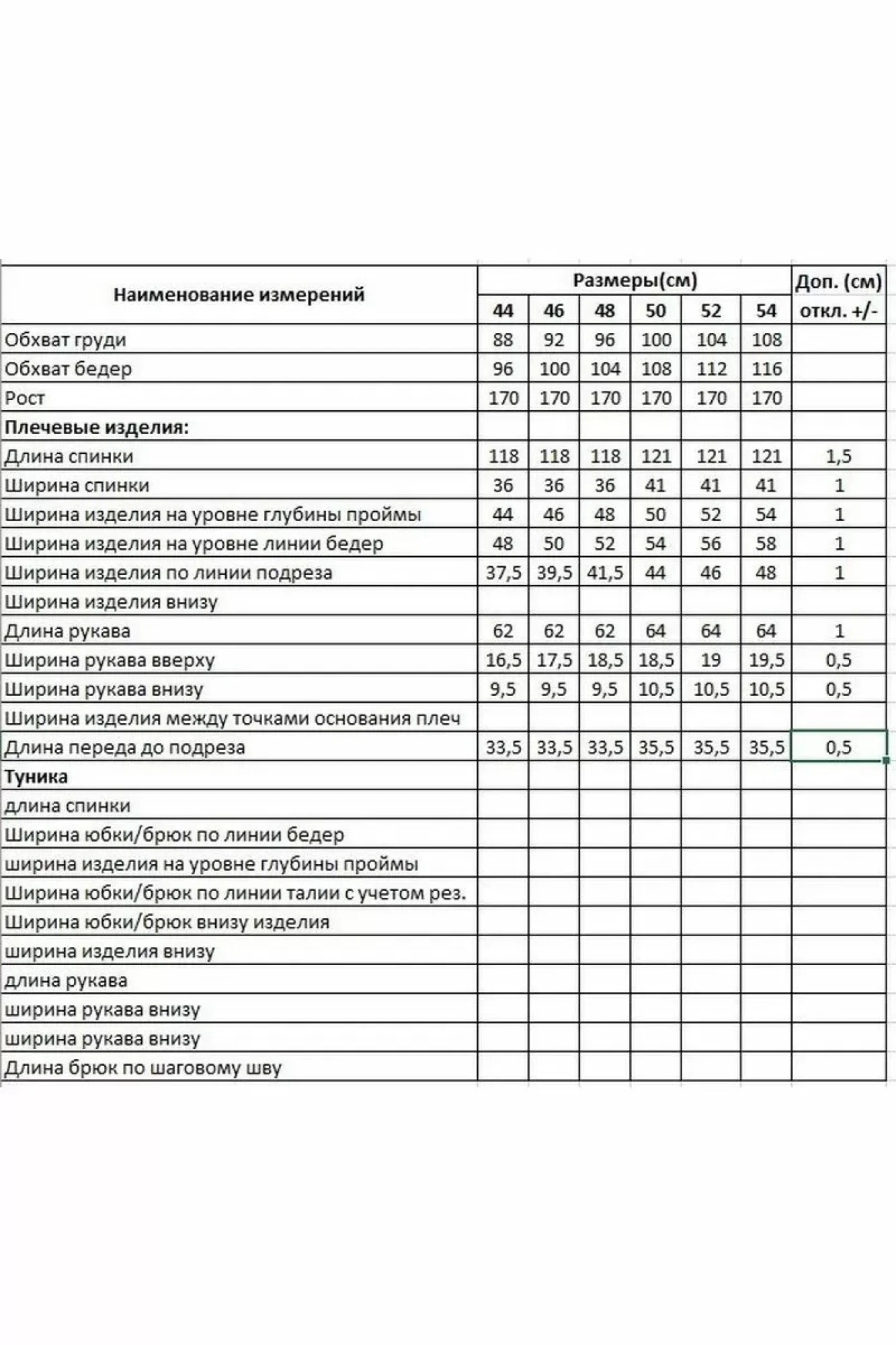 Таблица размеров