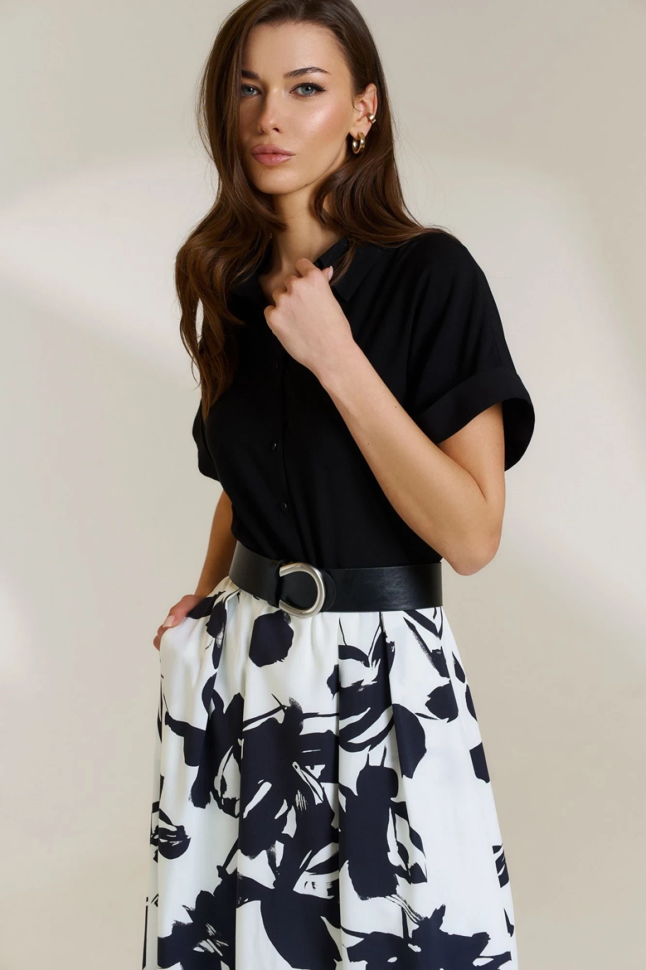 Платье женское приталенного силуэта на подкладке по юбке. Воротник отложной на стойке, планки по лифу цельнокроеные, рукав спущенный цельнокроеный с притачной отложной манжетой. Юбка со складками, с карманами "хулиганами". Застежка по лифу на пробивные петли и пришивные пуговицы, по спинке потайная молния. В комплекте имеется широкий пояс на пряжке из экокожи.