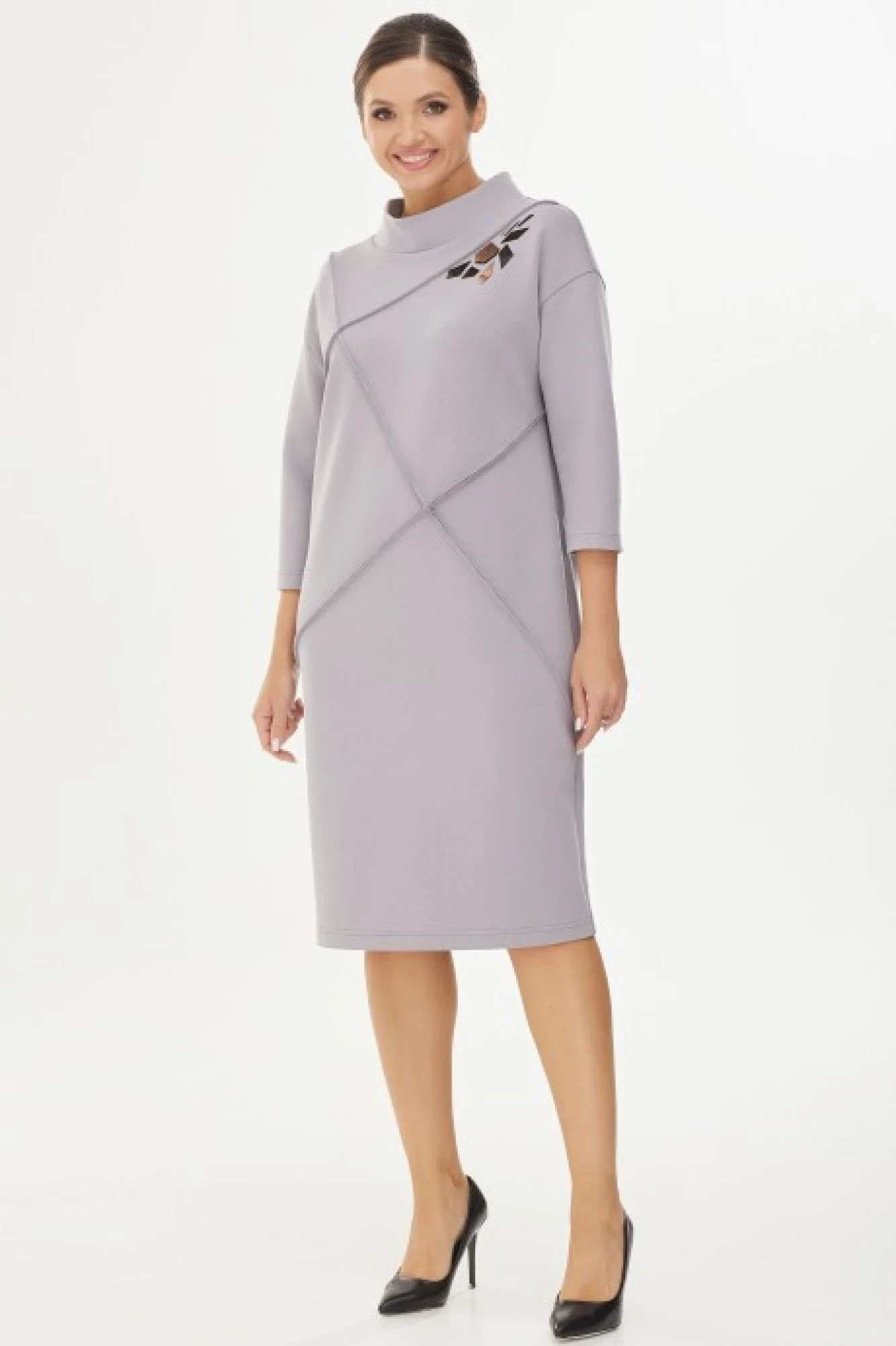 Платье женское полуприлегающего силуэта длиной ниже линии колена, выполнено из трикотажного полотна. Перед состоит из шести декоративных частей, собранных швами наружу. По левой верхней части переда пришит декор. Воротник - стойка. Рукава одношовные, втачные длиной ¾.
