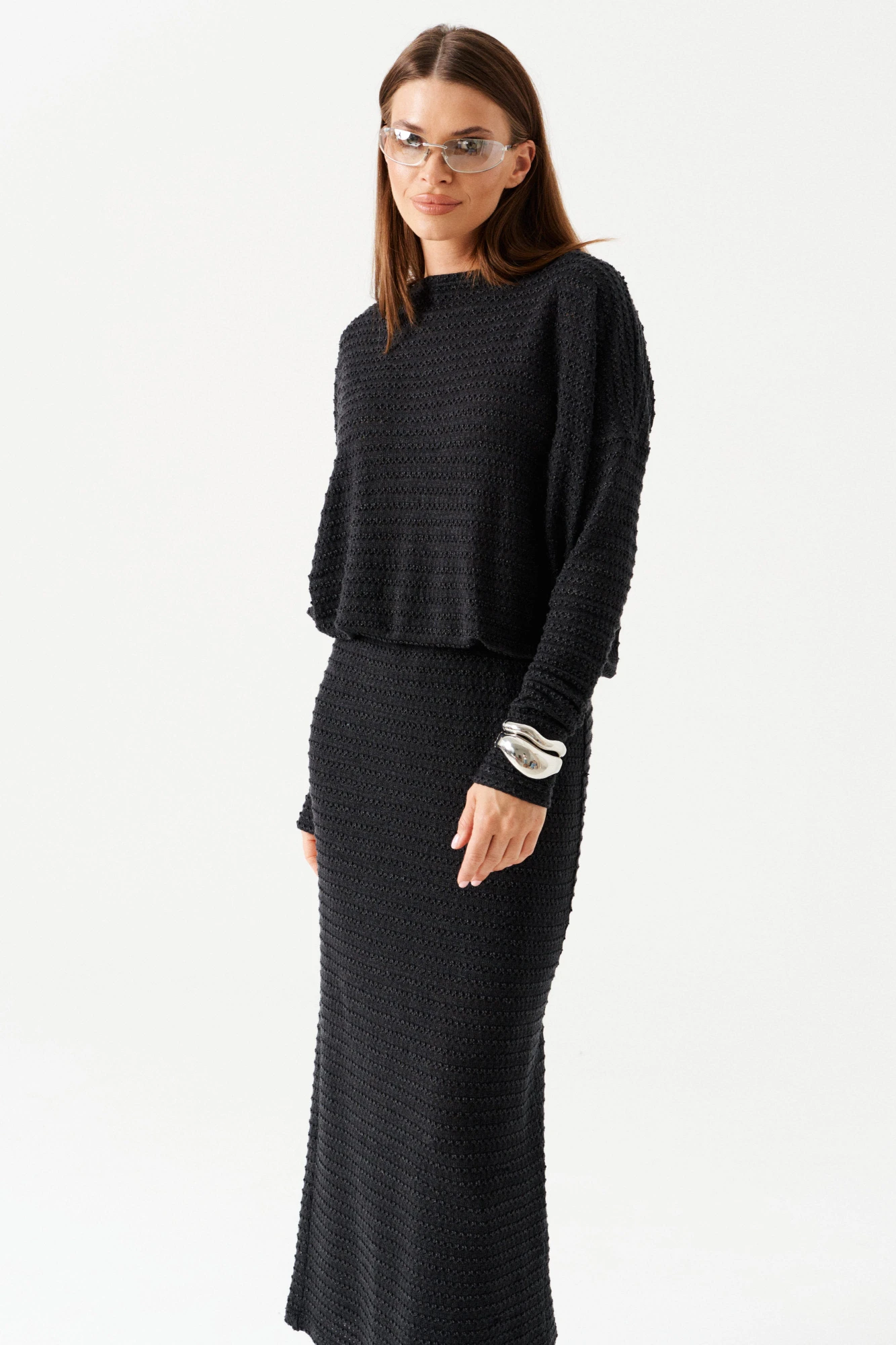 Платье женское из трикотажного полотна, длинное, приталенного силуэта, умеренного объема. Горловина углубленная, V-образной формы, с завязками из основной ткани со стороны спинки. Рукав цельнокроеного покроя с отрезной двойной частью. На уровне линии талии – двойной пояс на резинке