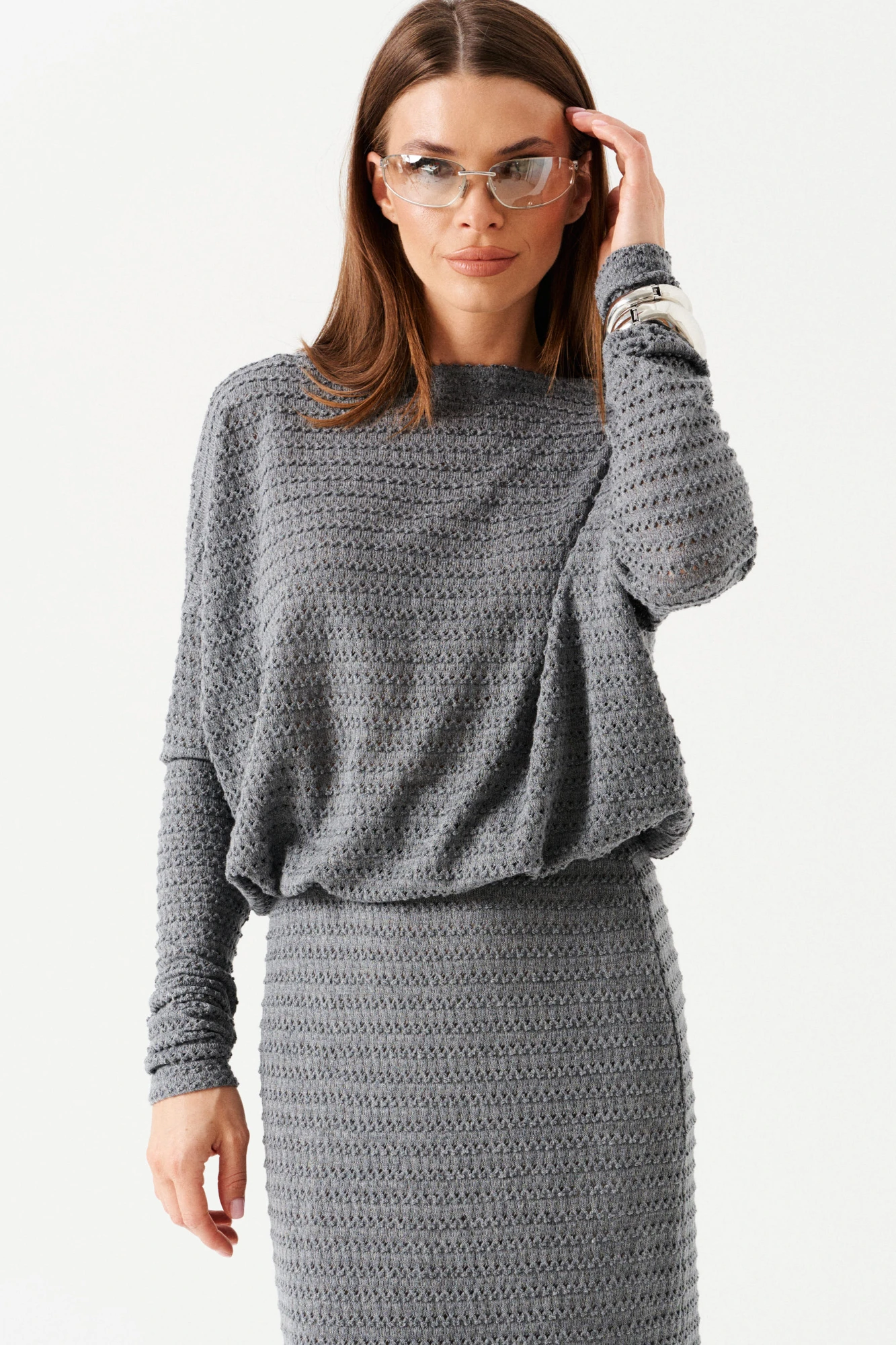 Платье женское из трикотажного полотна, длинное, приталенного силуэта, умеренного объема. Горловина углубленная, V-образной формы, с завязками из основной ткани со стороны спинки. Рукав цельнокроеного покроя с отрезной двойной частью. На уровне линии талии – двойной пояс на резинке