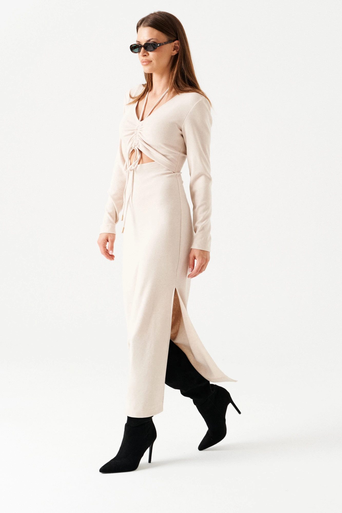 Платье женское из трикотажного полотна, длинное, прилегающего силуэта, с V-образным вырезом горловины. Перед платья состоит из двух частей. В верхней части переда средний шов, в котором обработаны две кулиски. В кулиски вставлена завязка, формирующая сборку на груди. Верхний край нижней части переда фигурной формы. Спинка цельная. Левый боковой шов заканчивается разрезом. Рукав втачной, длинный.