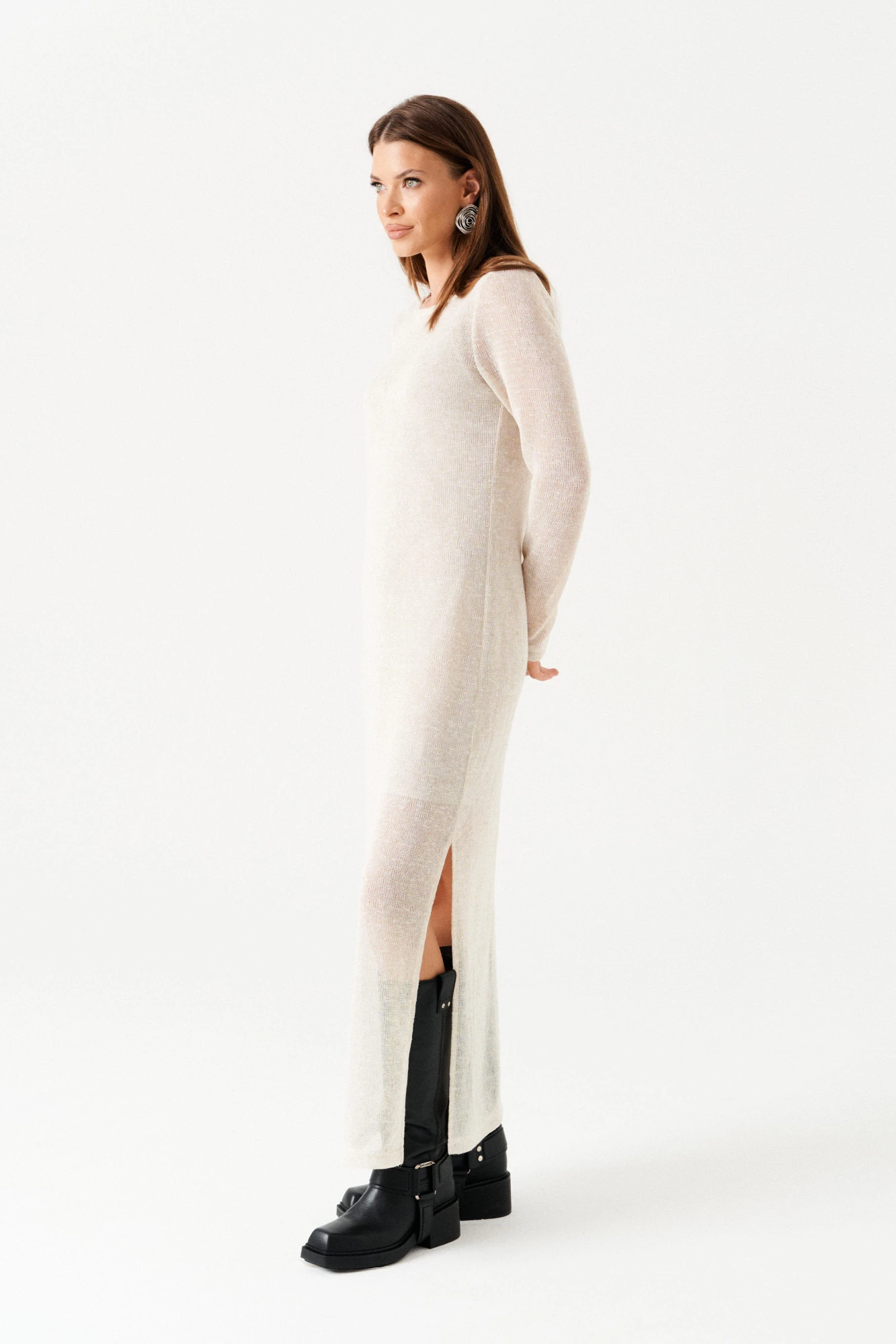 Двойное платье из трикотажного полотна. Верхнее платье прямого силуэта, с круглым вырезом горловины. Длина – макси. Нижнее платье полуприлегающего силуэта на бретелях из основной ткани. Длина нижнего платья – до колен.