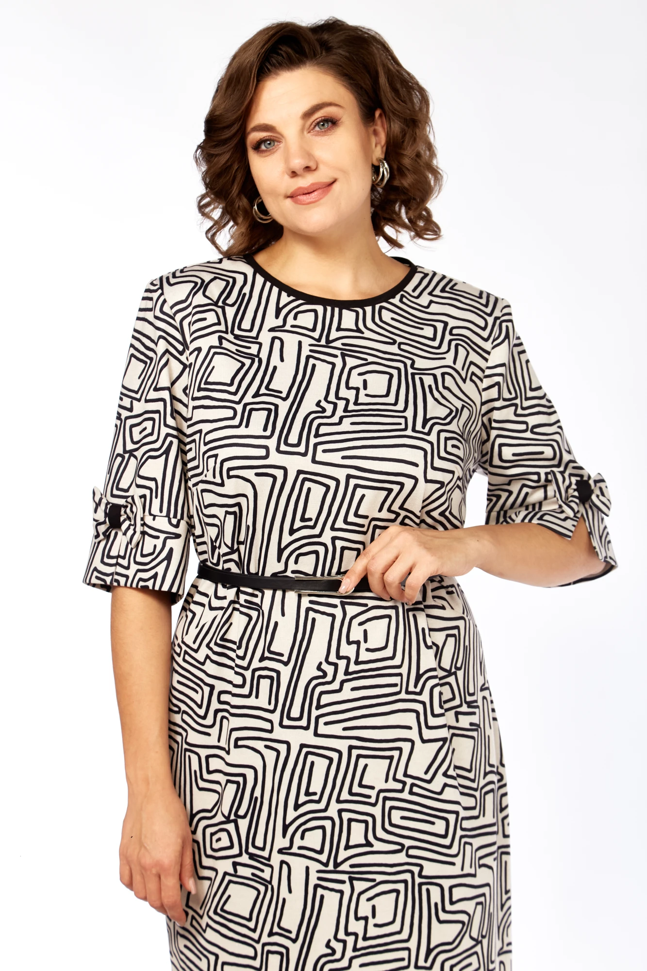 Женственное платье эффектно подчеркнет выгодные линии фигуры. Платье полуприлегающего силуэта, из трикотажного полотна. По переду нагрудные вытачки. Горловина округлой формы, с застежкой на петлю-пуговицу. Рукав втачной, украшен декоративным элементом, длина 7/8. Спинка имеет средний шов, внизу обработана шлица. В комплекте прилагается съемный пояс, который поможет сделать акцент на талии.