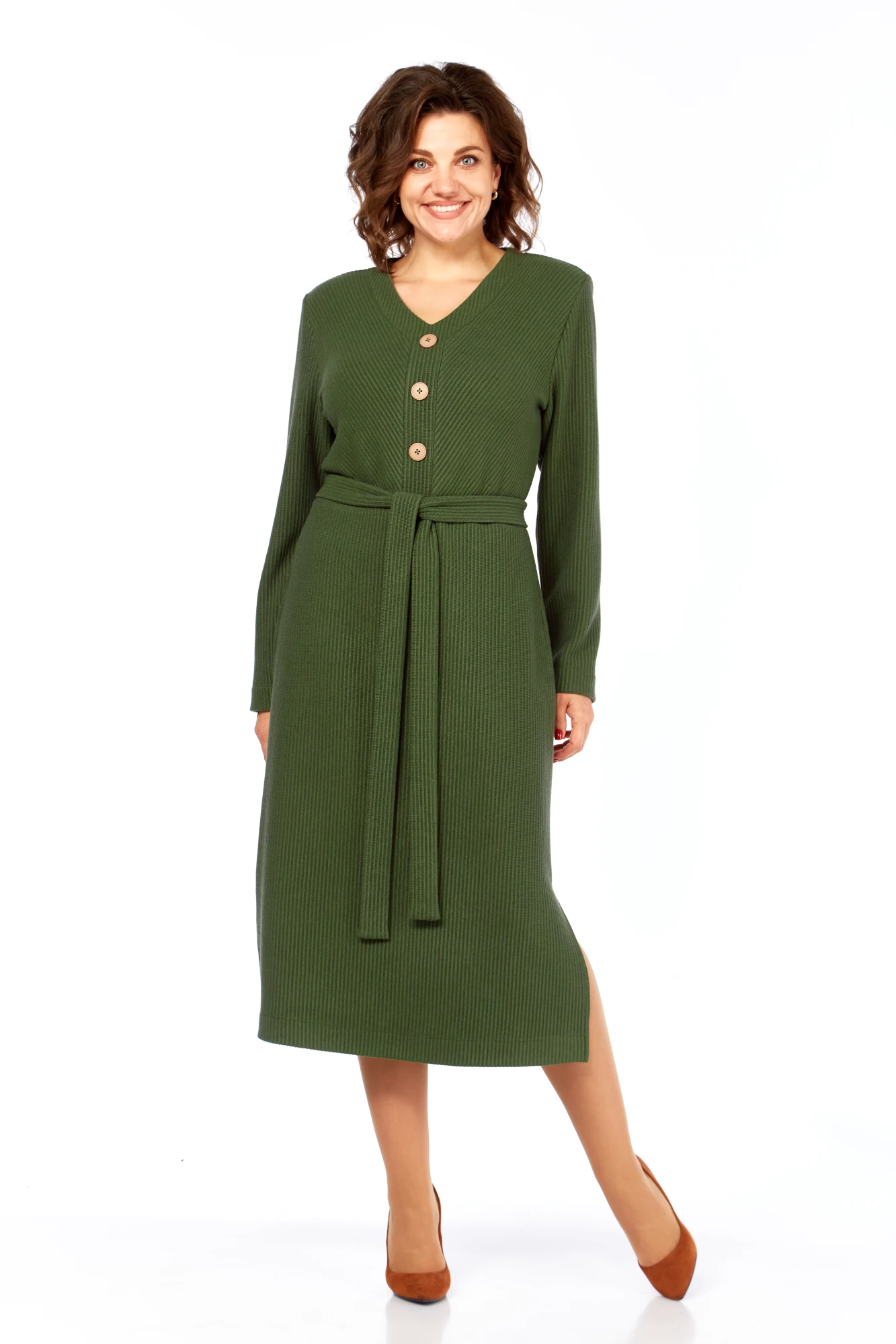 Образ, который поможет создать гармоничный и стильный внешний вид. Удобное платье полуприлегающего силуэта из трикотажного полотна, эффектно подчеркнет линии фигуры. По центру до уровня талии, пришивные декоративные пуговицы. V-образный вырез делает акцент на грудь. Рукав втачной. В боковых швах предусмотрены разрезы. В комплекте прилагается съемный пояс из основной ткани