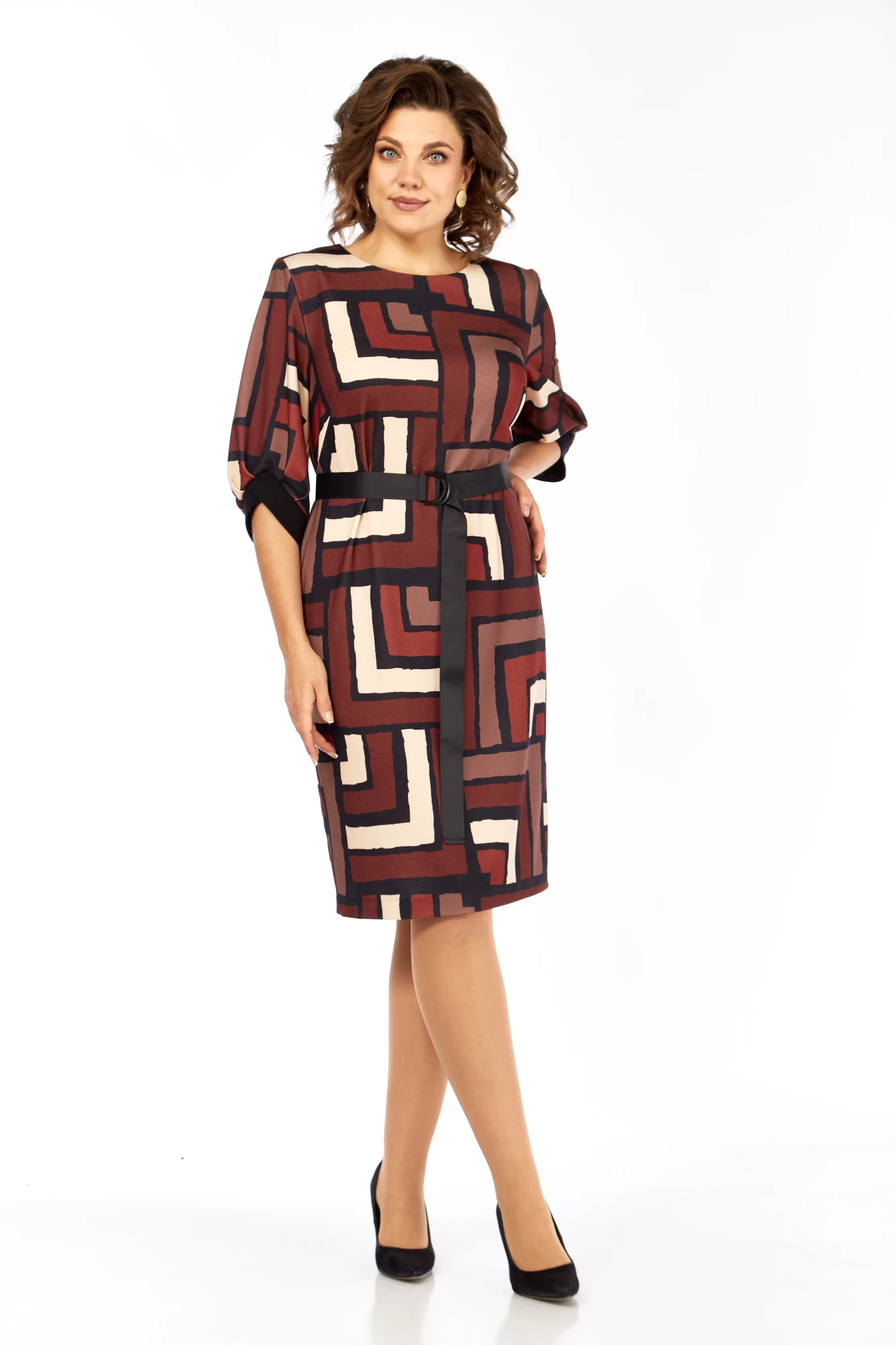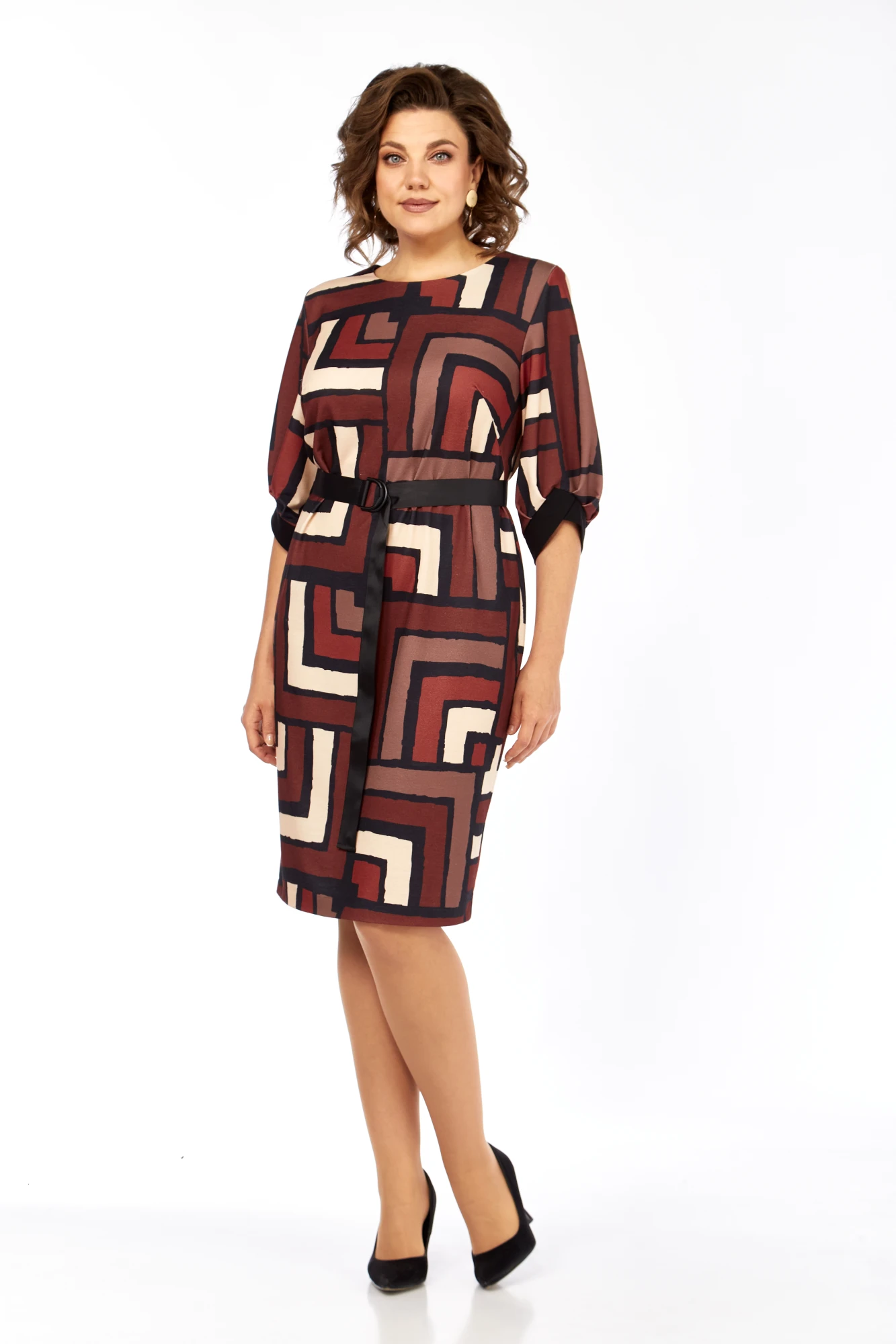 Платье из трикотажного полотна, геометрического рисунка, полуприлегающего силуэта. По переду нагрудные вытачки выходящие из бокового шва. Горловина округлой формы, на обтачке. Спинка с талиевыми вытачками. Рукав втачной, 3/4 длина, одношовный. Рукав формы "фонарик" по низу имеет мягкие складки, обработан притачной фигурной манжетой. К платью прилагается съемный пояс.