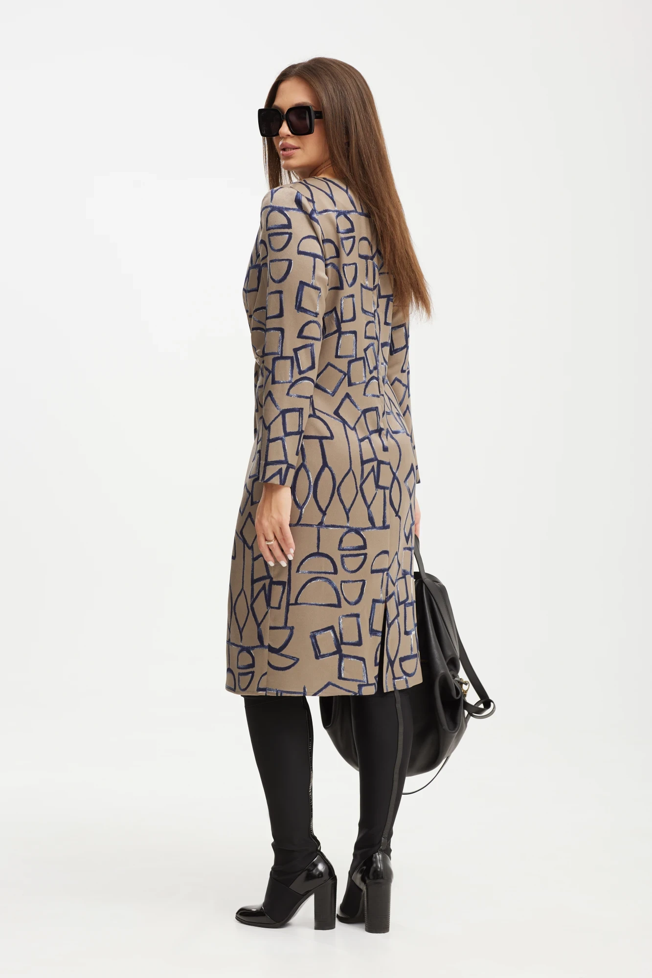 Платье женское, полуприлегающего силуэта. Вырез горловины V-образный. По переду подрезы и асимметричные драпировки. Спинка со средним швом, заканчивающимся шлицей. Рукав втачной, длинный.