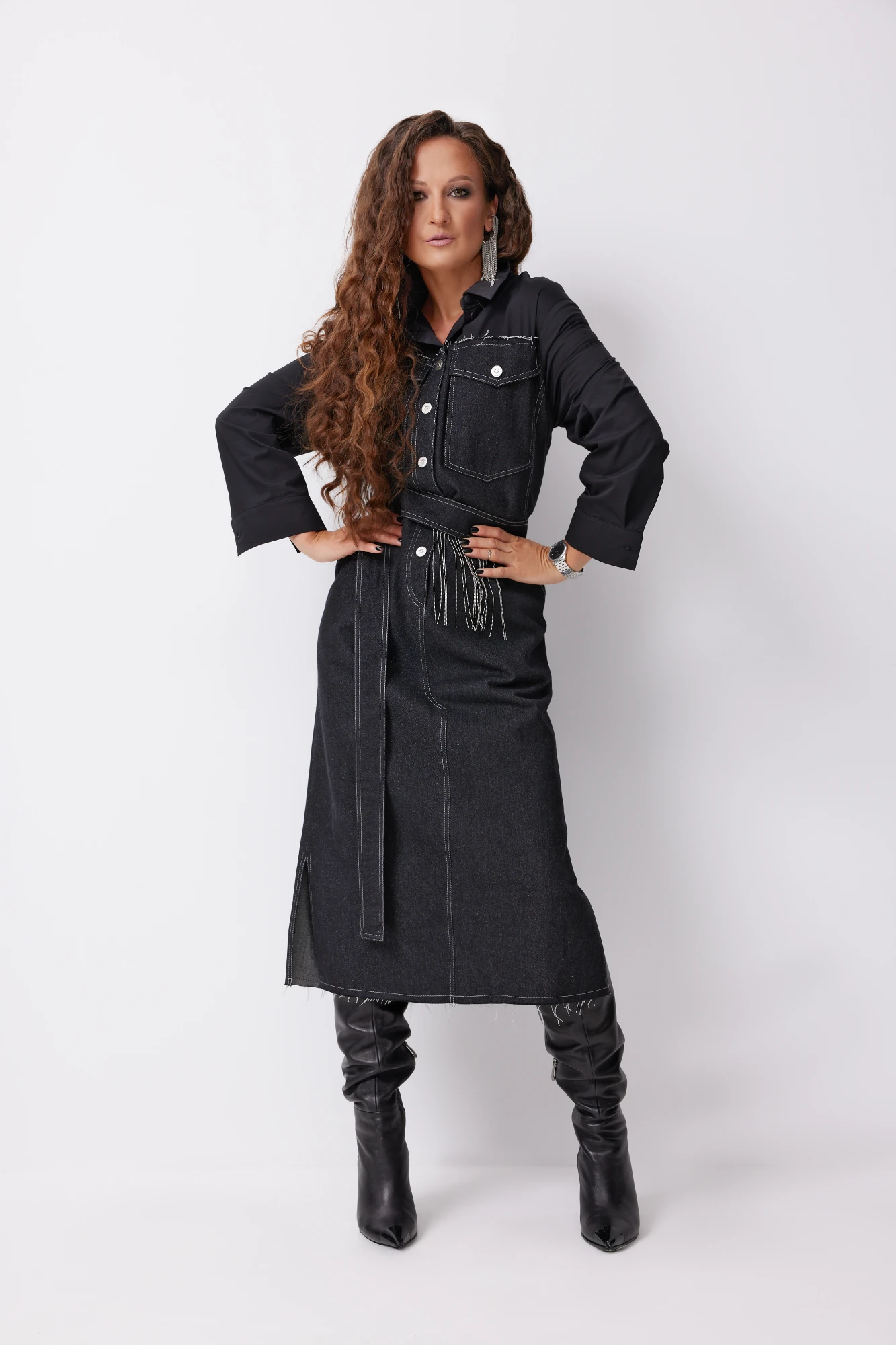 Платье женское, выполнено из двух видов ткани:хлопок и джинс. Платье прямого силуэта с втачным длинным рукавом на притачной манжете с застежкой на петлю-пуговицу. Рукав с разрезом и складкой по низу. Воротник рубашечного типа с отрезной стойкой. Платье с центральной застежкой в виде планки на кнопках. Спинка с горизонтальной кокеткой и горизонтальными рельефами. По низу спинки декоративные паты с кнопками. Перед с горизонтальной кокеткой, фигурными рельефами, в которых расположены карманы в швах и фигурными накладными карманами с клапаном, застегивающимися на кнопку. Платье с разрезами в боковых швах и съемным поясом с полукольцами и элементом в виде металлической цепочки. Низ платья и кокетки с открытым срезом. Платье с декоративными двойными строчками