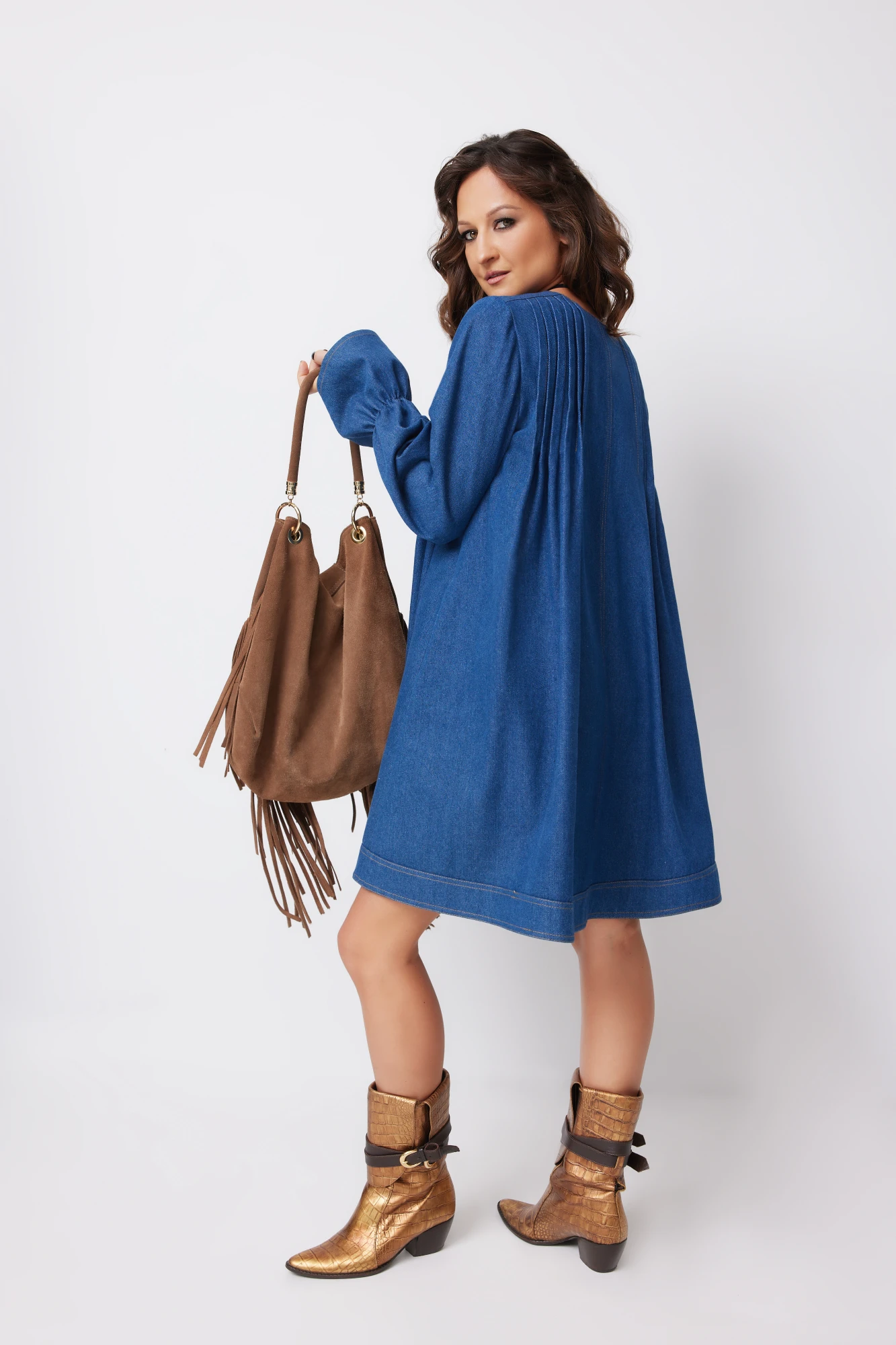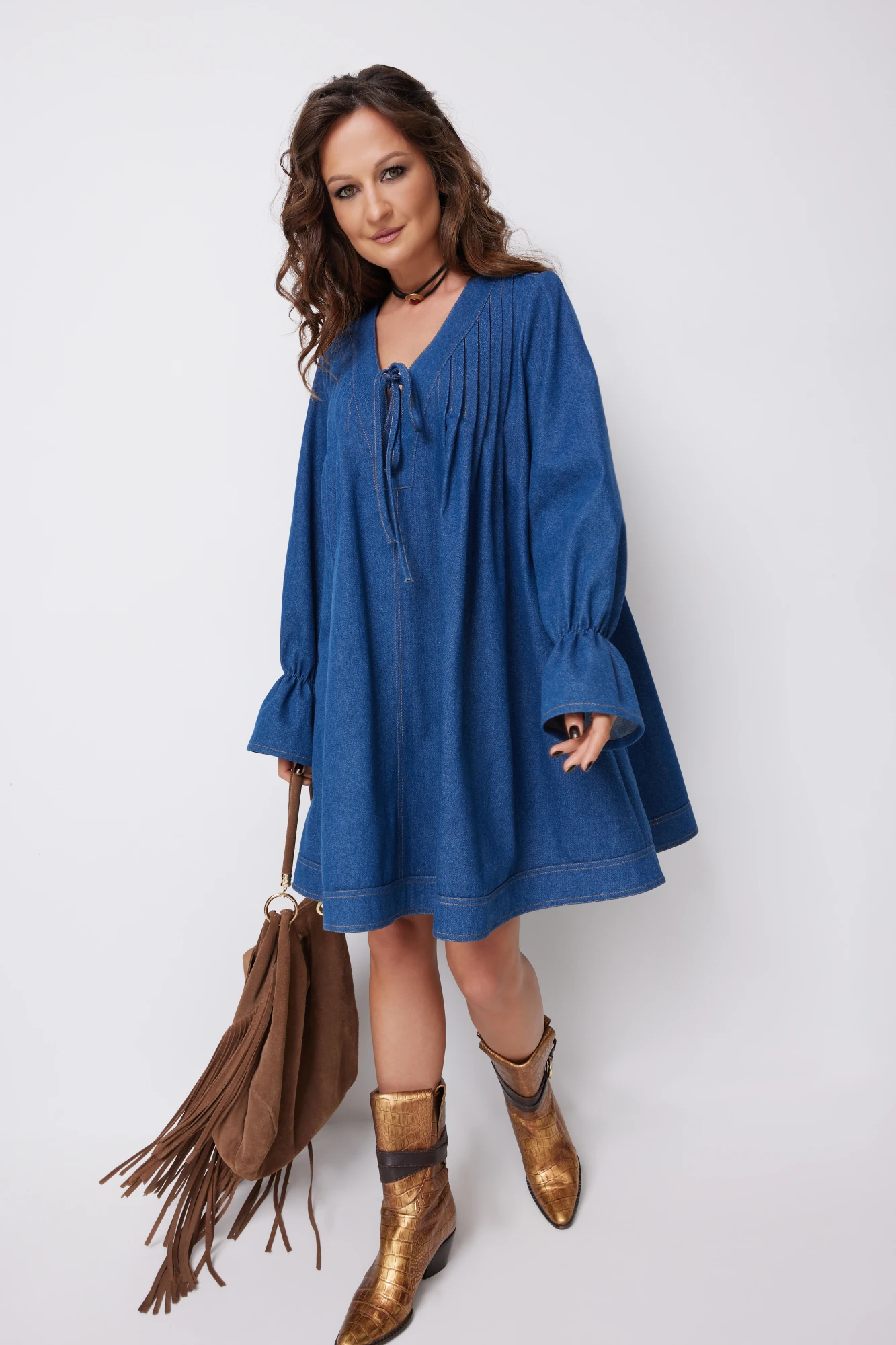 Платье женские А-образного силуэта с втачным одношевным длинным рукавом и воланом на резинке. Спинка со средним швом и декоративнымискладками, застроченными в  верхней части. Перед с отрезной кокеткой-погон. Вырез горловины Y-образный с декоративной фигурной планкой с завязкой, перед со средним швом, декоративными складками по бокам так же застроченны сверху. В боковых швах карманы. Низ платья с притачной планкой и контрастной нашивкой.