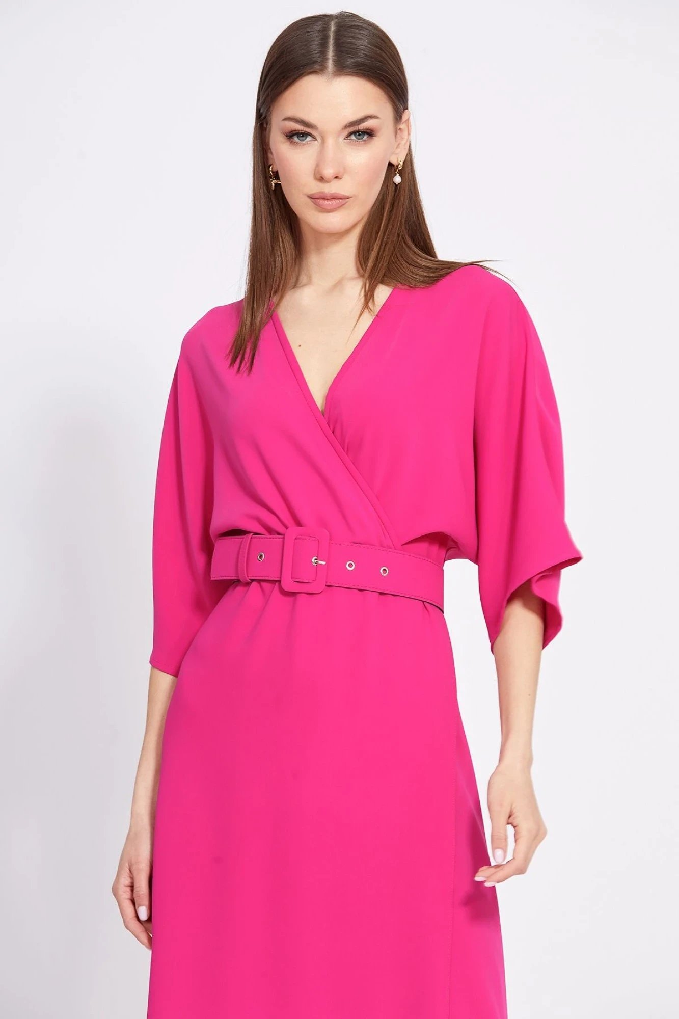 Платье выполнено из однотонной плательной ткани. Платье полуприлегающего силуэта, отрезно по линии талии, длиной миди. Перед лифа и юбки выполнен ""на запах"". Спинка цельная. Горловина V-образной формы. Рукав покроя ""кимоно"", длиной до локтя. По талии настрочена эластичная тесьма. В комплект входит съемный ремень с обтяжной пряжкой.