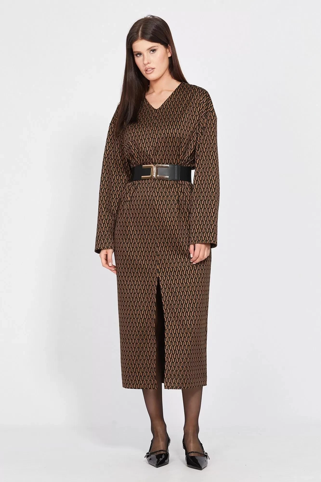 Платье выполнено из трикотажного полотна с геометрическим принтом. Платье прямого силуэта, длиной миди. Спинка цельная. Горловина V-образной формы. Плечевой шов спущен. Рукав рубашечного покроя, одношовный. В боковых швах карманы. Спереди в среднем шве разрез. В комплект входит съемный ремень из эластичной тесьмы с пряжкой.