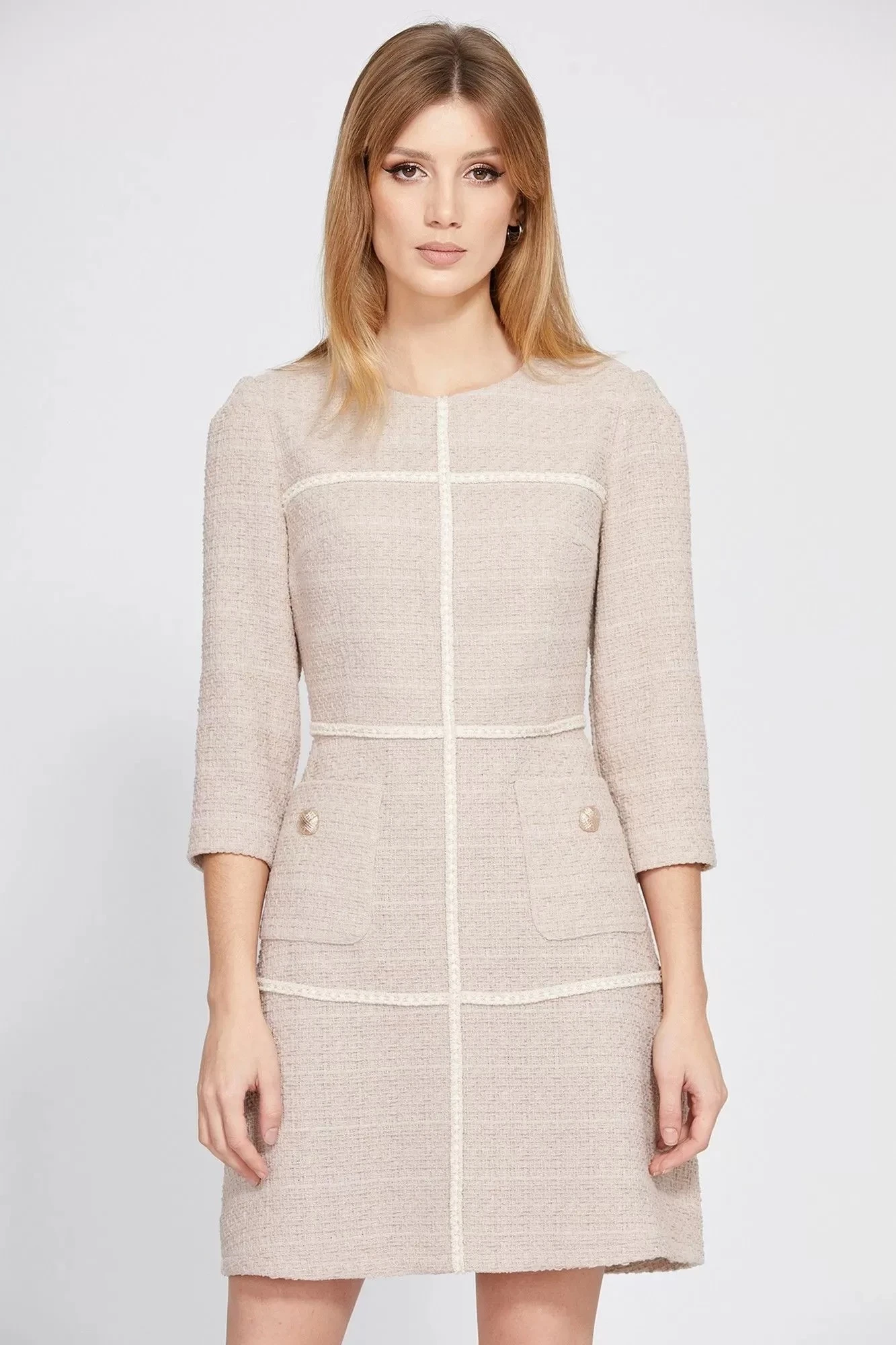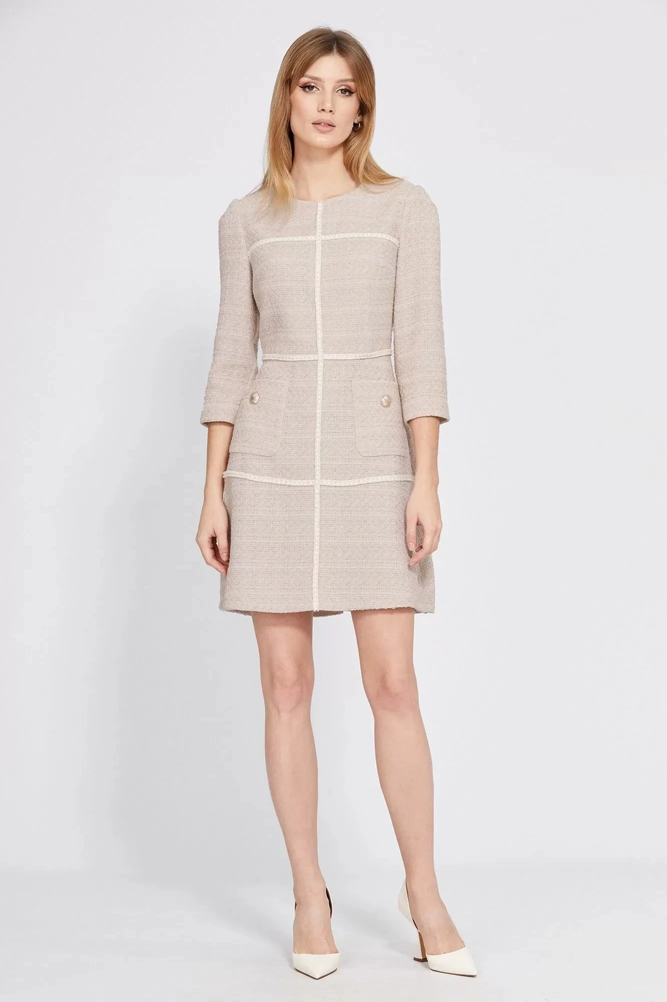 Платье выполнено из твида. Платье Х-образного силуэта, отрезное по линии талии, длиной выше линии колена. Застежка на потайную молнию в среднем шве спинки. Горловина округлой формы. Рукав втачного покроя, одношовный, длиной 3/4. Юбка расширена к низу. По переду два кармана с пуговицами. Заднее полотнище со средним швом. Платье на отлетной по низу подкладке. Платье декорировано тесьмой.