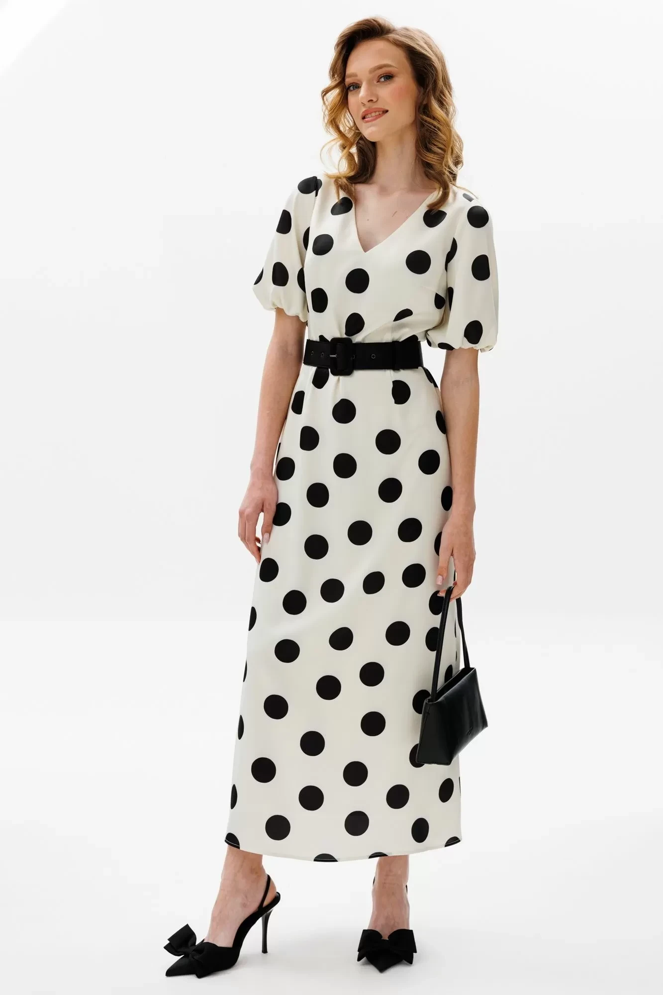 Платье выполнено из атласа с принтом "горох". Платье Х-образного силуэта, длиной миди, отрезное по линии талии. Горловина V-образной формы. В среднем шве спинки застежка на потайную молнию. Плечевой шов укороченный. Рукав втачной, одношовный, длиной чуть ниже линии локтя . Рукав расширен к низу и обработан эластичной тесьмой. Юбка расширена к низу. Платье на отлетной по низу подкладке. В комплект входит съемный ремень из отделочной ткани.