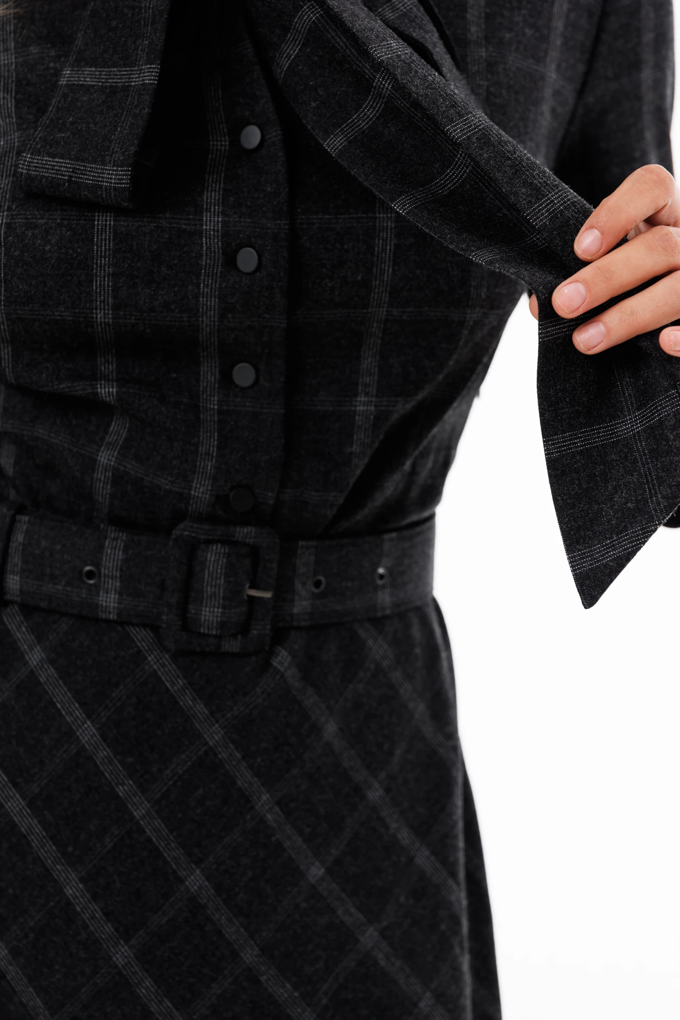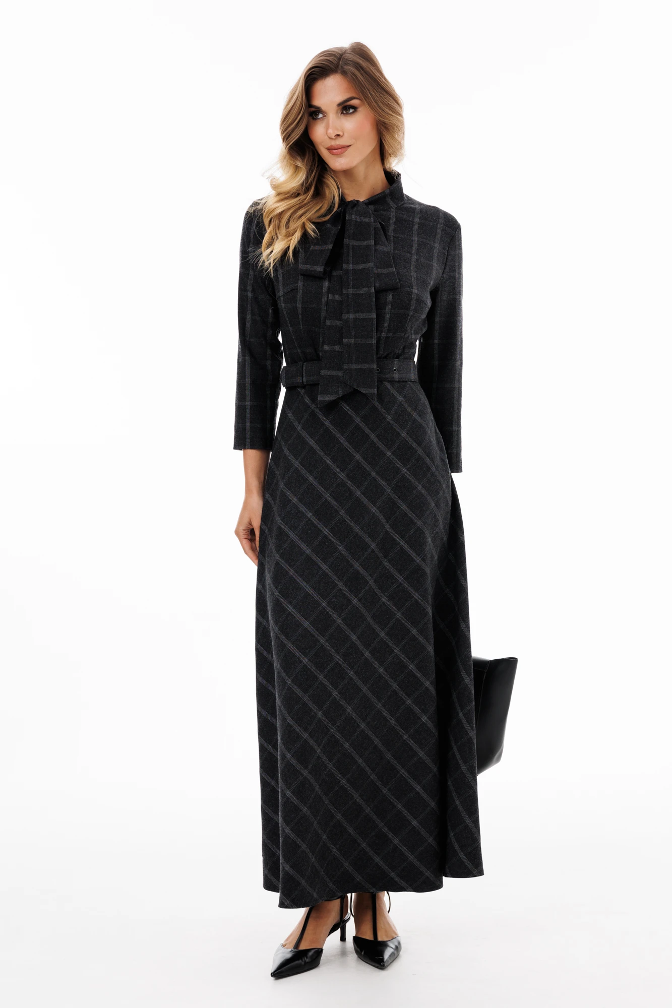 Платье выполнено из костюмной ткани в клетку. Платье Х-образного силуэта, длиной миди. Платье отрезное по линии талии. Спереди горловина V-образной формы, застежка на пуговицы. Воротник стойка, переходящий в бант. Рукав втачной одношовный, длиной 3/4. Юбка покроена по косой. В левом боковом шве застежка на потайную молнию. В комплект входит ремень из основной ткани с обтяжной пряжкой.