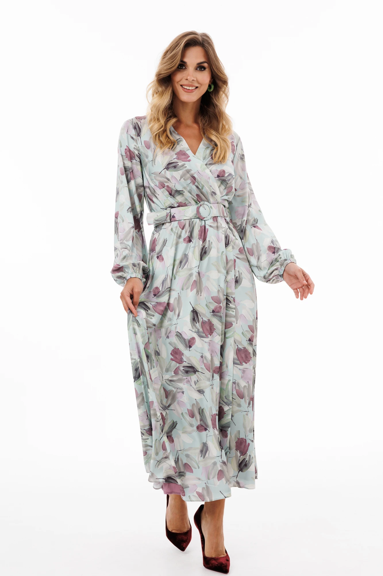 Платье выполнено из креп-атласа с принтом. Платье Х-образного силуэта, отрезное по линии талии, длиной миди. Перед выполнен ""на запах"" со складками по линии талии. Спинка цельная. Вырез V-образной формы. Рукав втачной, одношовный, с напуском. Низ рукава собран на эластичной тесьме. Юбка расширена к низу. Платье на отлетной по низу атласной подкладке. В комплект входит съемный ремень с обтяжной пряжкой.