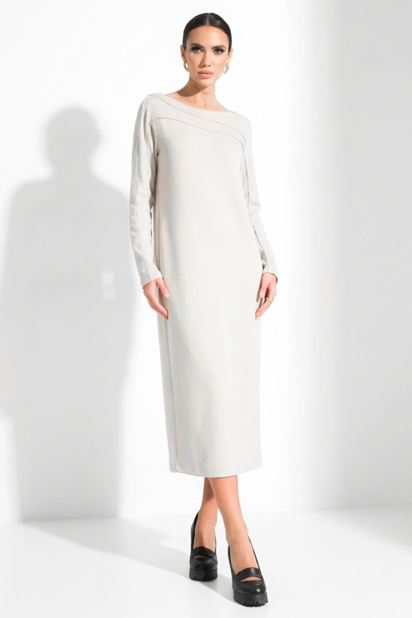 Стильное платье светло-бежевого оттенка длиной миди с длинными рукавами. Модель выполнена из мягкой и комфортной ткани, облегающего силуэт, но при этом дарит свободу движений. Особенность дизайна — асимметричный вырез горловины, который добавляет современности и изящества образу. Платье отлично подходит как для повседневной носки, так и для деловых или вечерних мероприятий. Универсальный цвет легко комбинируется с различной обувью и аксессуарами.