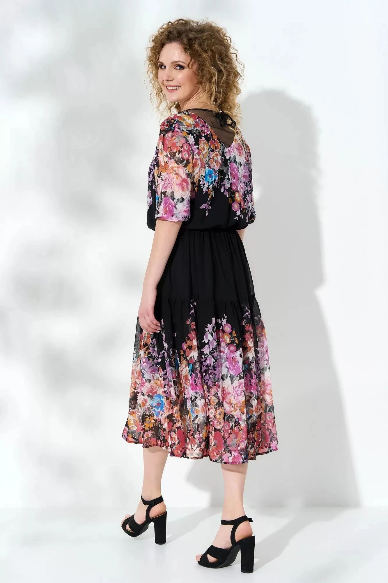 Платье женское полуприлегающего кроя, выполнено из шифоновой ткани. Изделие отрезное по линии талии, рукав втачной короткий, низ рукава обработан эластичной тесьмой. Горловина по лифу фигурная, По спинке платья имеется вставка из сетки и вырез "капелька". Платье на подкладке.