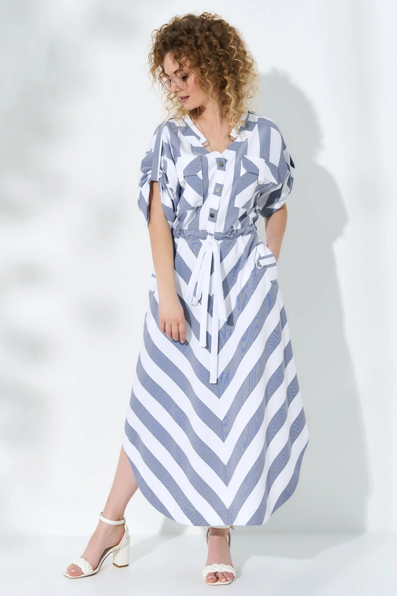 Платье женское выполнено из льна вишера, изделие отрезное по линии талии. Лиф изделия с v-образной горловиной и накладными карманами с клапаном, рукав втачной, приспущенный. На плечах платья расположены паты. По переду изделия планка с застежкой петля-пуговица. Юбка изделия разрезная по центру с совмещенной полоской. В боковых швах имеются функциональные карманы с клапаном. По талии расположена кулиса с поясом-завязкой. Низ изделия фигурный