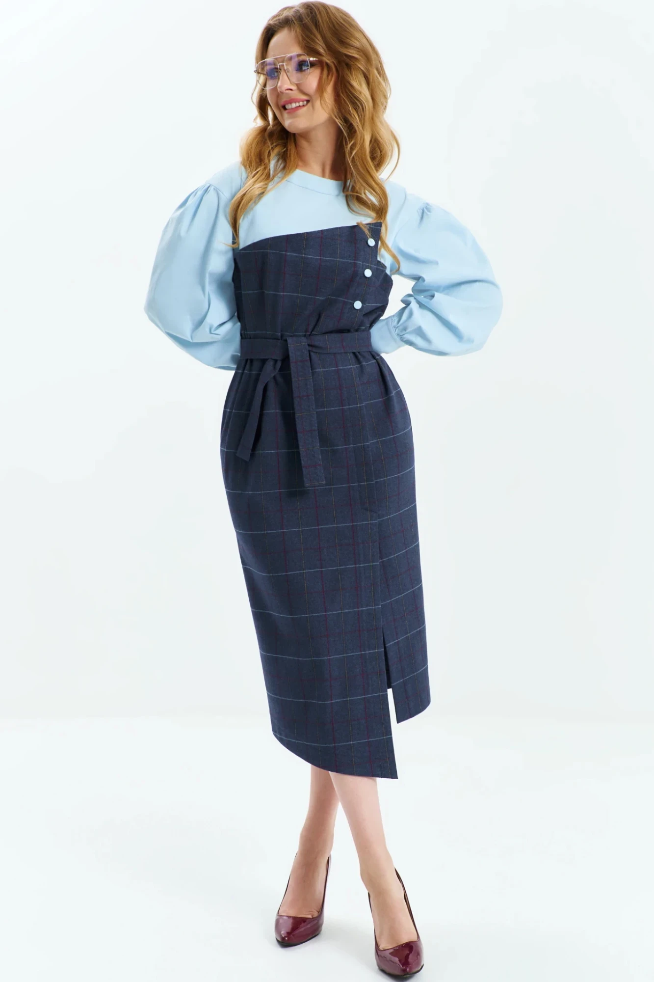 Платье женское выполнено их сочетания плательной ткани и блузочного хлопка, изделие полуприлегающего кроя ассиметричное, горловина- округлая, рукав приспущенный втачной длинный с манжетой по низу. Спинка разрезная с застежкой перли-пуговицы. Низ изделия ассиметричный, с небольшим разрезом по переду.