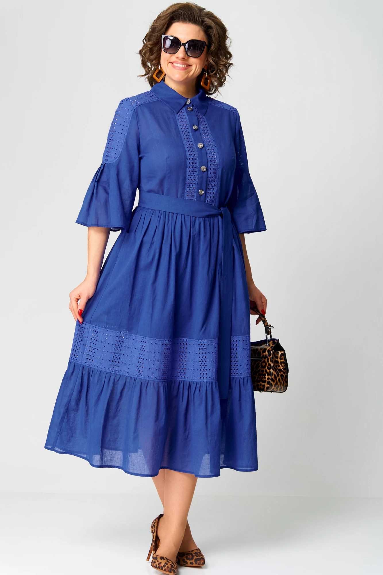 Платье женское нарядно-повседневное полуприлегающего силуэта до талии расширенное к низу. Выполнено из хлопка в сочетании с отделкой из хлопокового шитья. Вырез горловины воротик на стойке рубашечного типа, рукав втачной с отделочными вставками из шитья. расширенный к низу за счет встречных складок. По талии и по нижнему волану юбки сборка и отделочная вставка из шитья. По верхней части спинки фигурная кокетка из шитья. Застежка до талии на обметанные петли и пуговицы. Декором платья служит съемнй пояс из основной ткани.