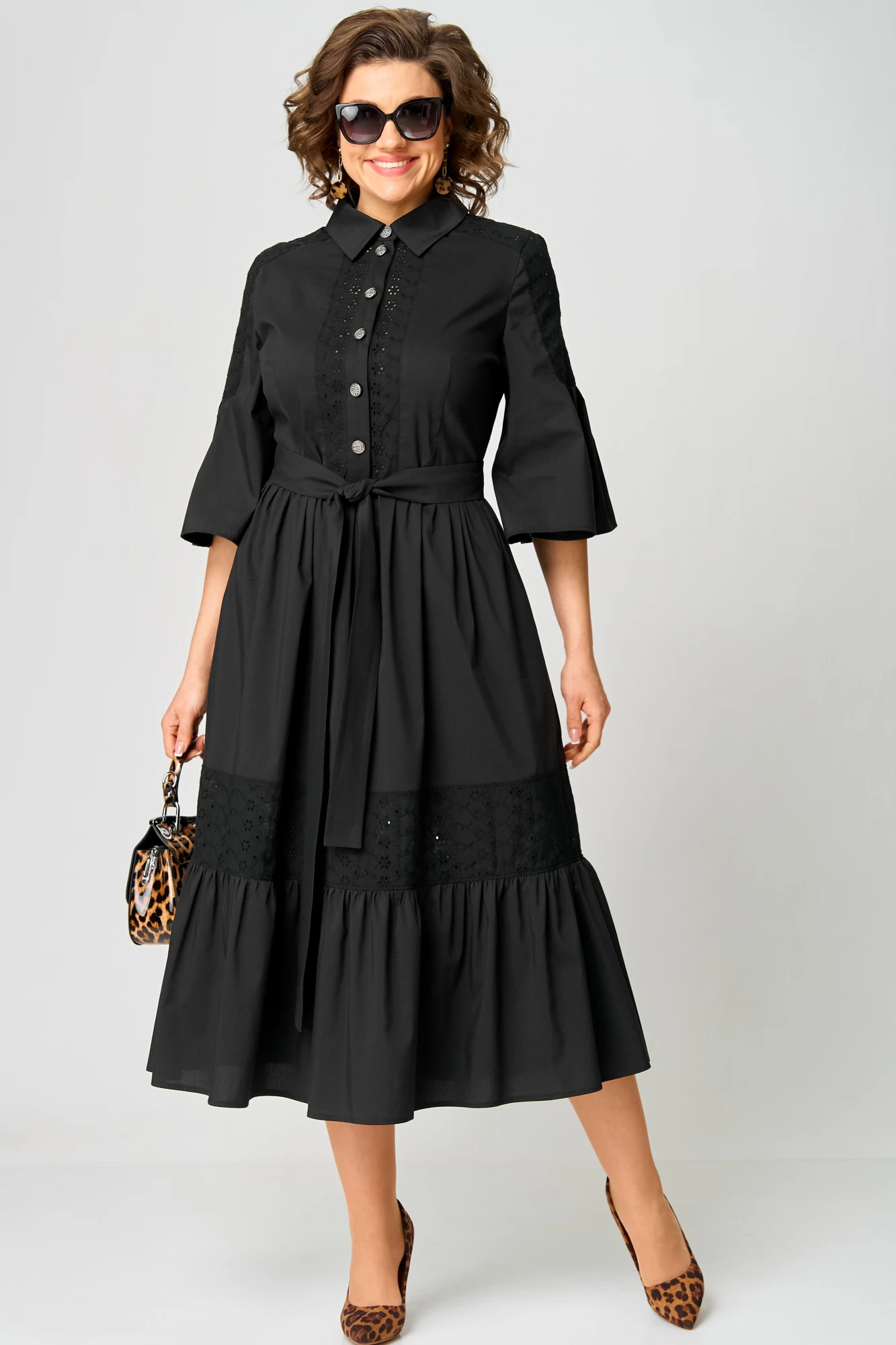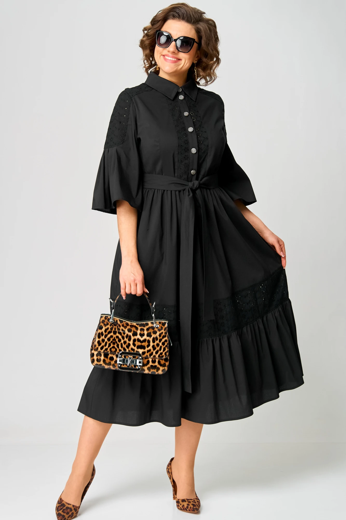 Платье женское нарядно-повседневное полуприлегающего силуэта до талии расширенное к низу. Выполнено из хлопка в сочетании с отделкой из хлопокового шитья. Вырез горловины воротик на стойке рубашечного типа, рукав втачной с отделочными вставками из шитья. расширенный к низу за счет встречных складок. По талии и по нижнему волану юбки сборка и отделочная вставка из шитья. По верхней части спинки фигурная кокетка из шитья. Застежка до талии на обметанные петли и пуговицы. Декором платья служит съемнй пояс из основной ткани.