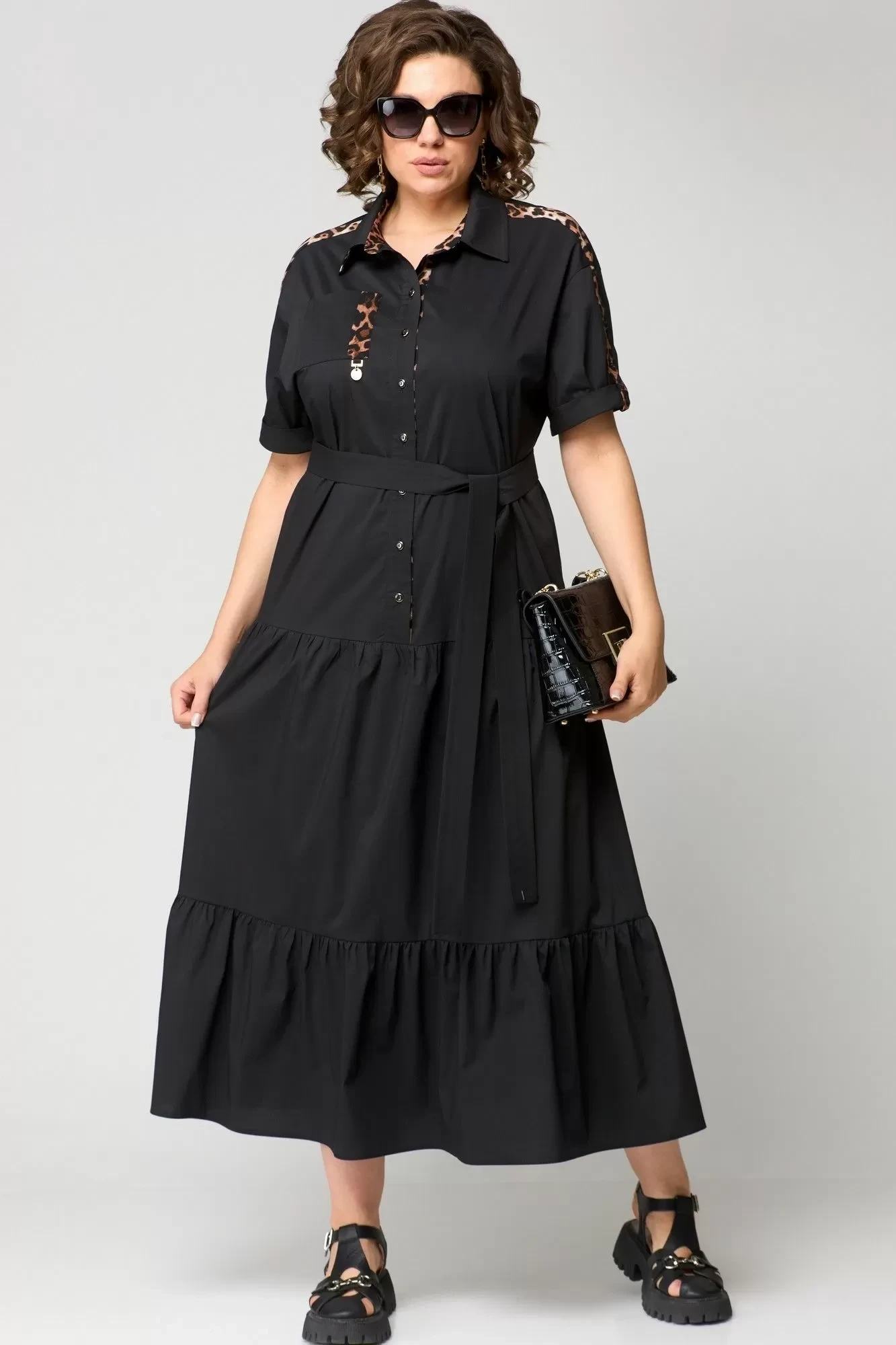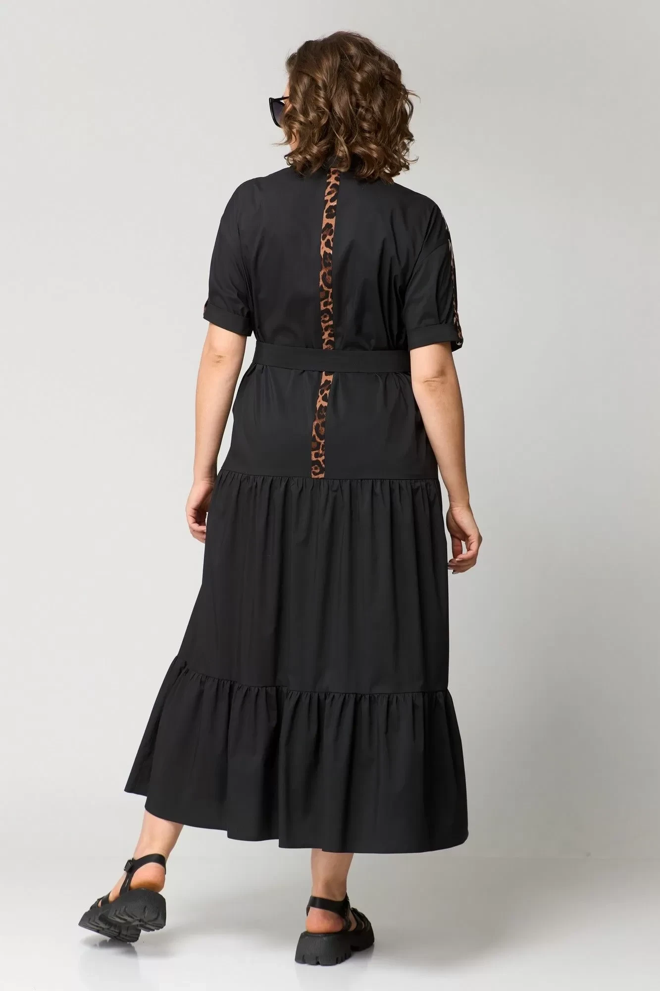 Платье женское повседневное полуприлегающего силуэта расширенное к низу, выполнено из хлопка в соетании с отделкой с анималистичным принтом. Вырез горловины воротник на стойке, плеч пущенное. Платье отрезное ниже линии талии бедер с воланами собранными на сборку. По правой стороне полочки накладной карман с декором. Вставка из отделочной ткани по карману, центру спинки, вротнику и руквам служат декором к платью. В комплекте есть съемный пояс.