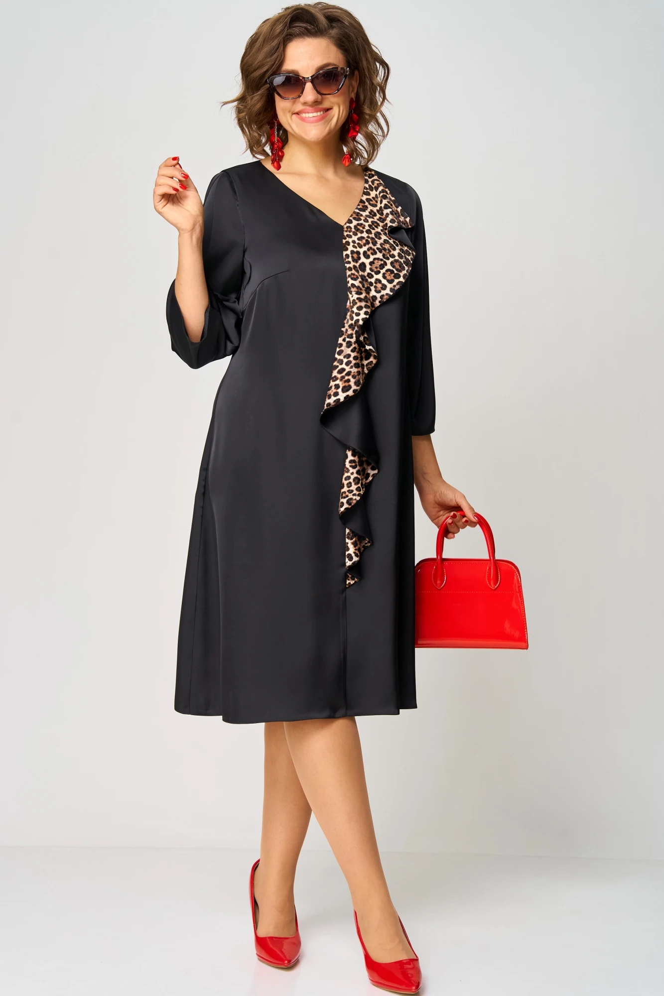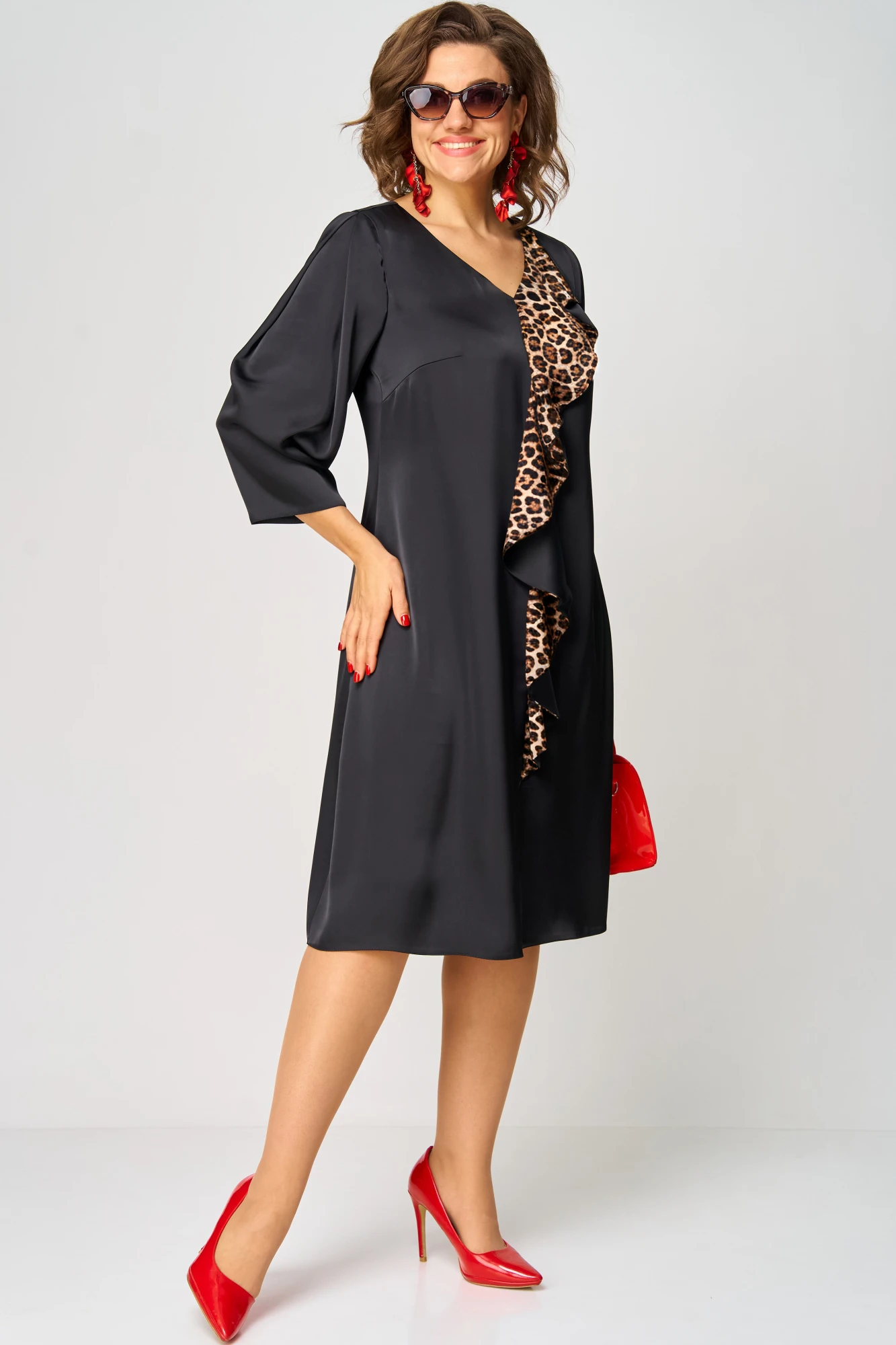 Платье женское А-образного силуэта, выполнено из плательной ткани в сочетании с отделкой. Вырез горловины V-образный обработан обтачкой. Рукав втачной 7/8, со встречной складкой по центру. От плеча по левой стороне переходящее по центру платья вставлен отделочный элемент в виде волана.