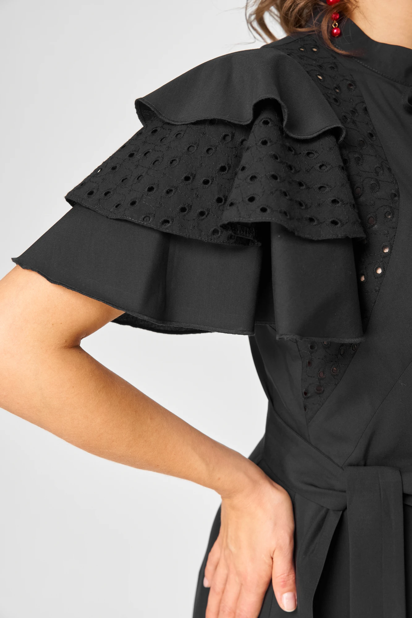 Платье женское стильное шикарное нарядно повседневное из хорошего красивого хлопка, что выглядит очень дорого в сочетании с шитьем. Вырез горловины стойка с небольшим вырезом "капелька" и завязками, что создает эффект шарма и легкости. Рукав втачной состоит из трех воланов, что придает изделию одновременно элегантность и стиль. Платье отрезное по линии талии. Низ платья юбка с фигурным элементом на глубокий запах с отделкой из кружева. Все элементы изделия создают шик, красоту, легкость, неповториность и изысканность. Декором служит детали из шитья и сьемный пояс.