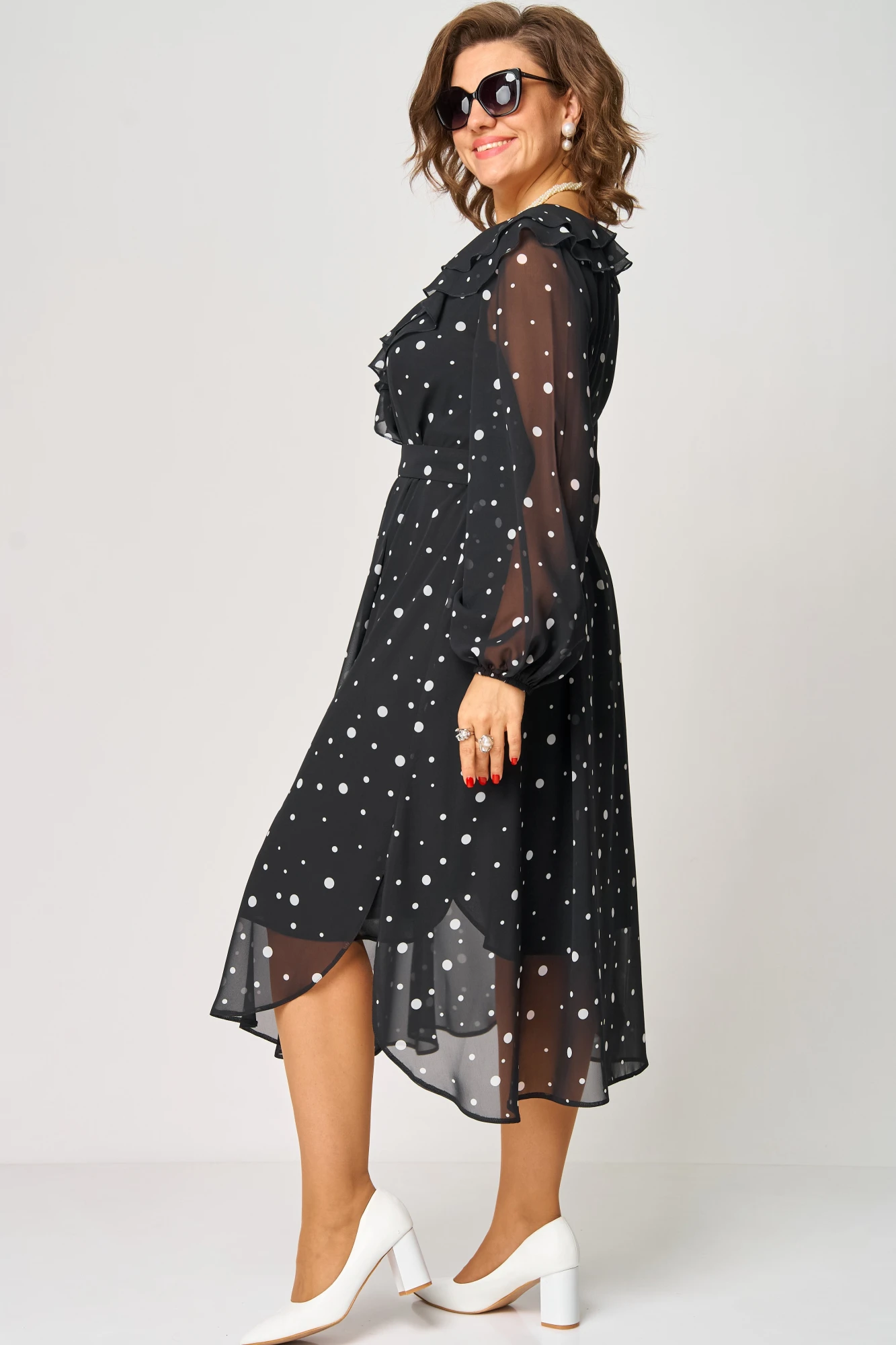 Платье женское нарядно-повседневное полуприлегающего силэта до талии расширенное к низу. Платье отрезное по талии на трикотажной подкладке, выполнено из креп-шифона. Вырез горловины V-образный обработан обтачкой, по горловине полочки и спинки двойные воланы. Рукав втачной по низу на резинке. По юбке небольшие складки. В боковых швах обработаны разрезы, низ фигурный. Декором платья служит съемный пояс из основной ткани и рюши по горловине платья.
