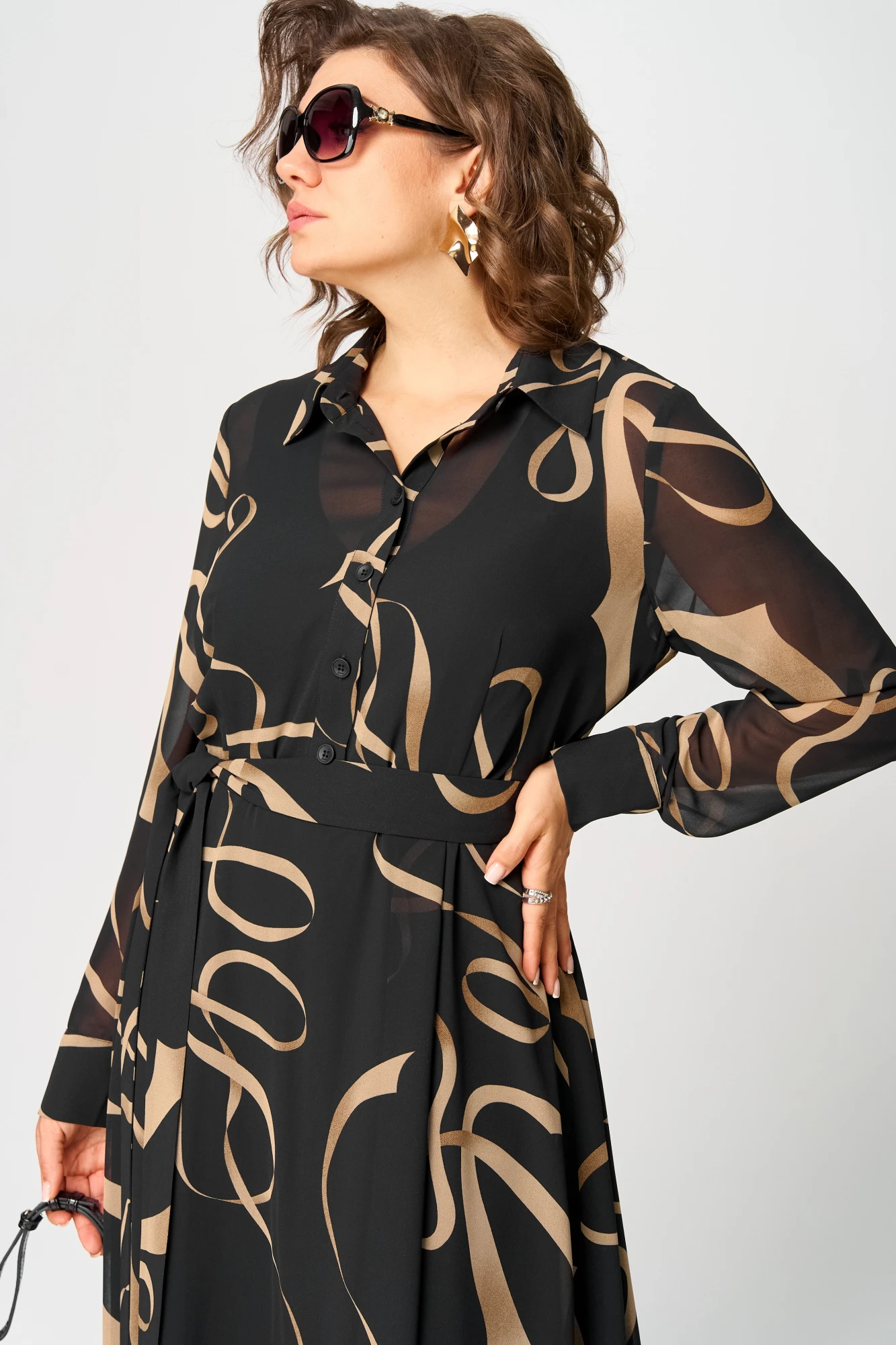 Платье женско нарядно-поседневное полуприлегающего силуэта до таии расширенное к низу. Платье отрезное по талии, выполнено из креп-шифона, врез горловины воротник на стойке рубашечного типа, рукав втачной по низу на притачной манжете. Низ платья фигурный, в боковых швах обработаны разрезы. По юбке платья от талии трикотажная подкладка. Декором платья служит съемный пояс и принт самой ткани.