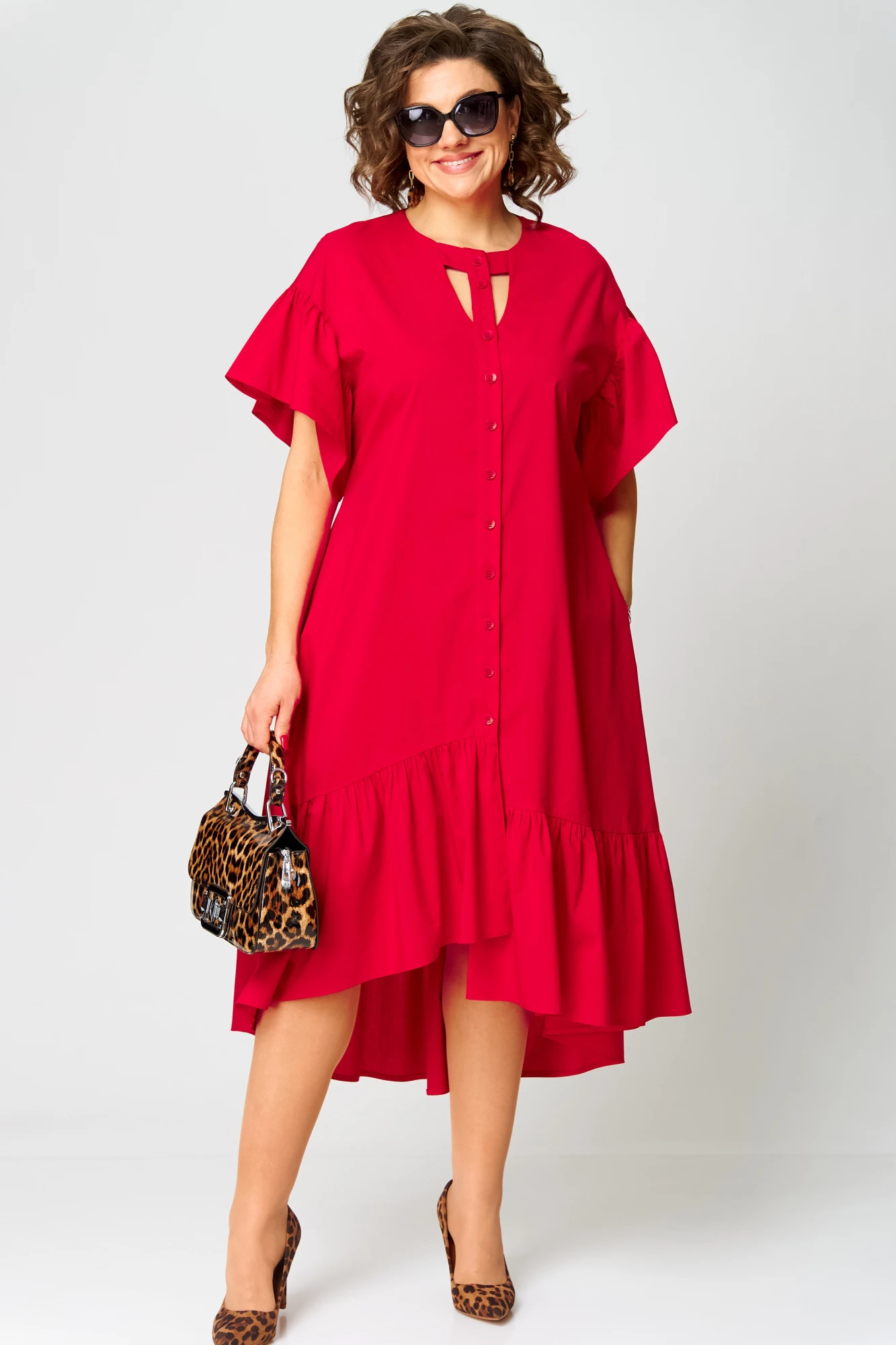 Платье женское нарядно-повседневное полуприлегающего силуэта расширенное к низу с ассиметричным воланом. Выполнено из хлопка. Вырег горловины круглый по центру с отделоным элементом. Планка - застежка до верху на обметанне петли и пуговицы. Рукав спущенный по низу с притачным воланом со сборкой. В боковых швах обработаны карманы. Низ платья фигурный. Декором платья служит съемный пояс из основной ткани.