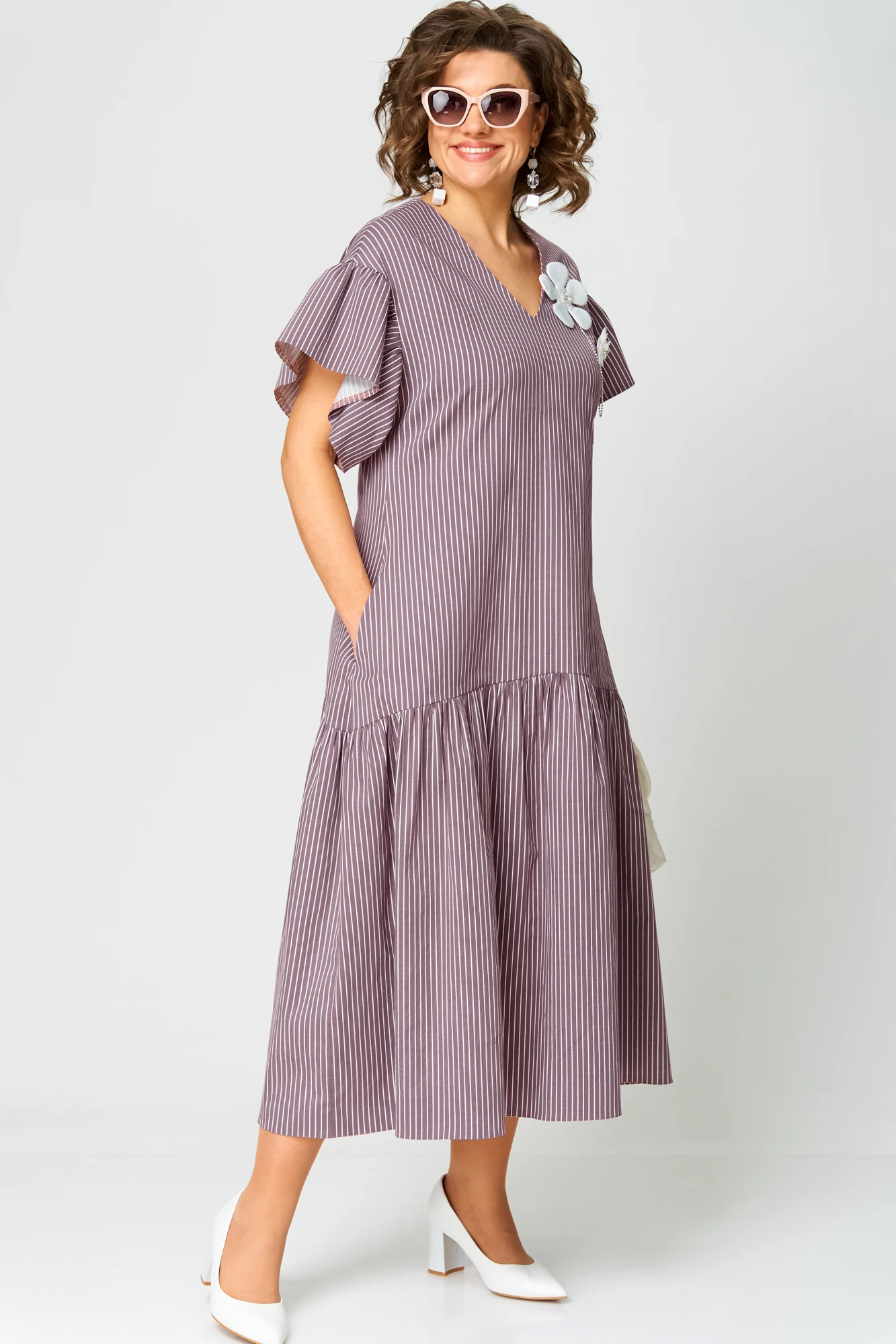 Платье женское нарядно-повседневное полуприлегающего силуэта расширенное к низу за счет волана со сборкой. Выполненео из хлопка. Вырез горловины V-образный, рукав втачной спущенный к низу с притачным воланом со сборкой. В боковых швах обраьотаны карманы. Декором платья служит съемный цветок.