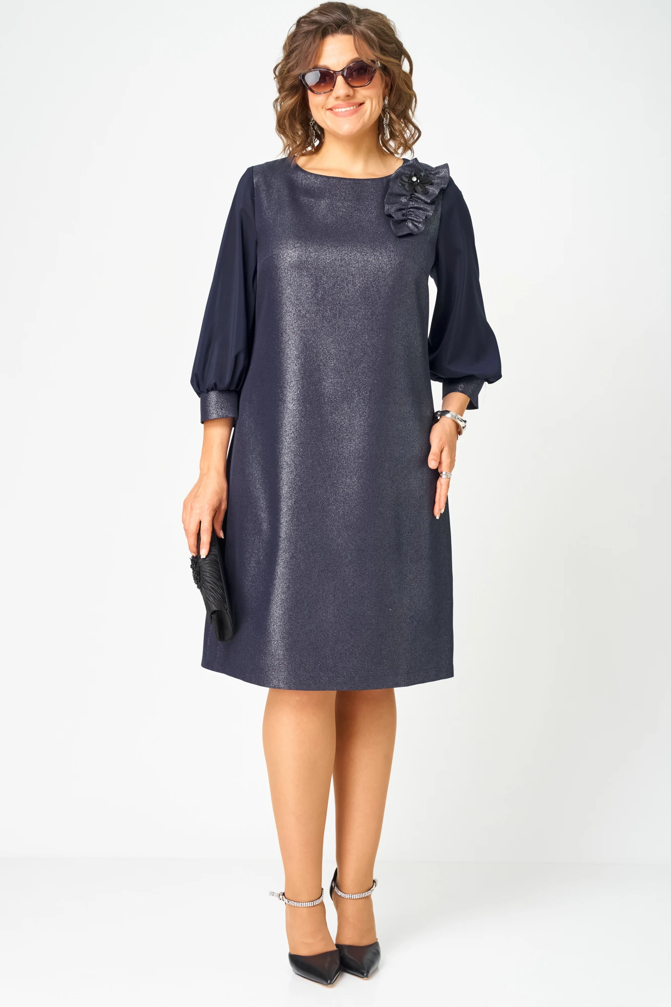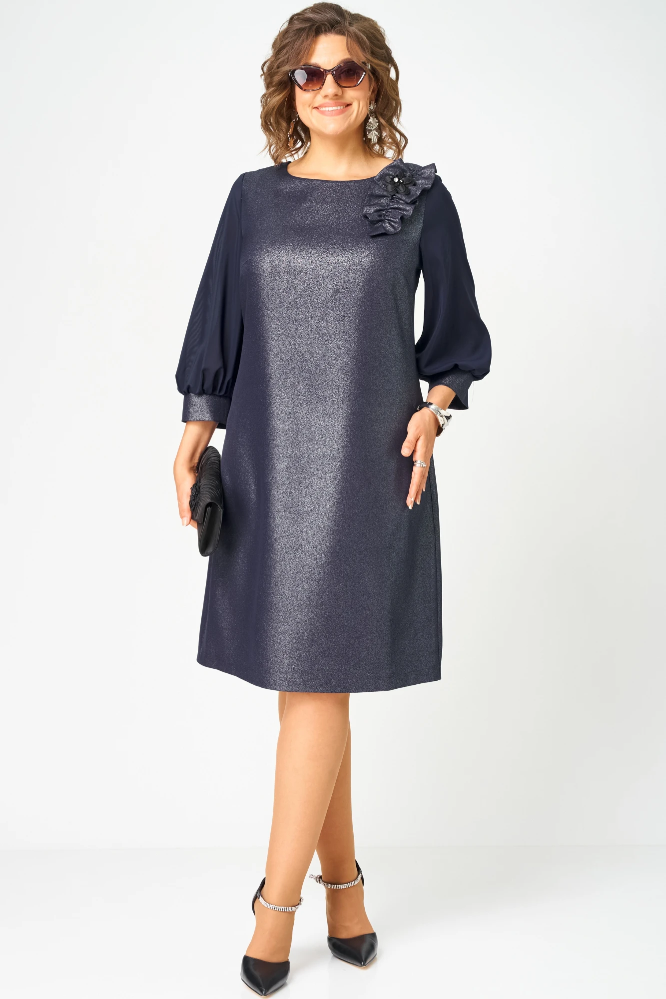 Платье женское полуприлегающего силуэта выполнено из плательной ткани с мерцающим пропитанным блеском (не сыпется) в сочетании с шифоном. Вырез горловины круглый на обтачке, по полочке нагрудные втачки, рукав втачной из шифона 7/8 по низу на сборке и притачной манжете. По спинке потайная тесьма - молния и вытачки.Декором платья служит декоративный пришивной элемент со съемной брошью.