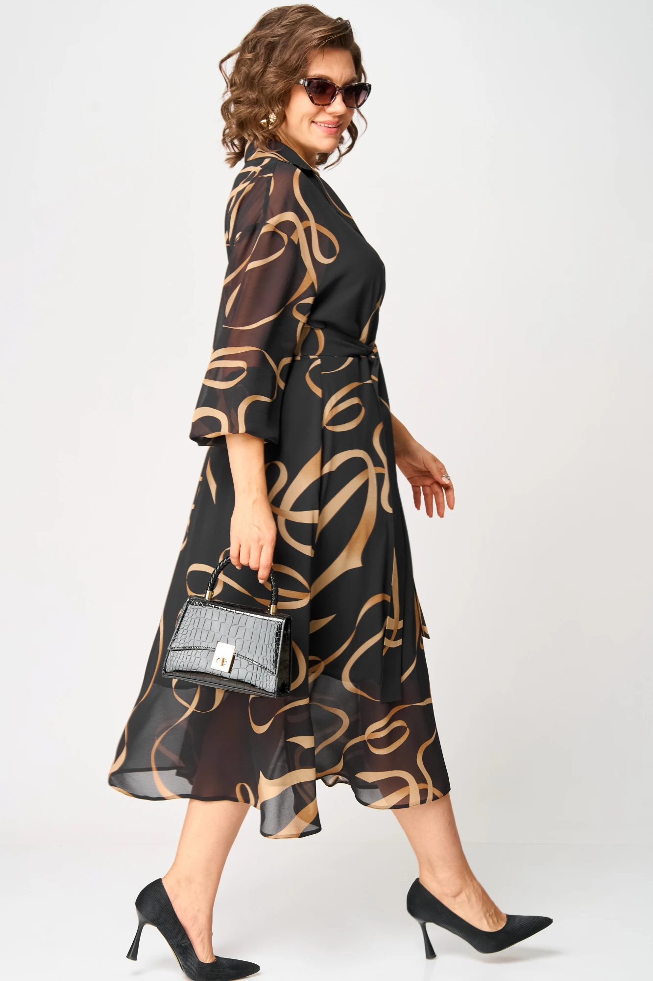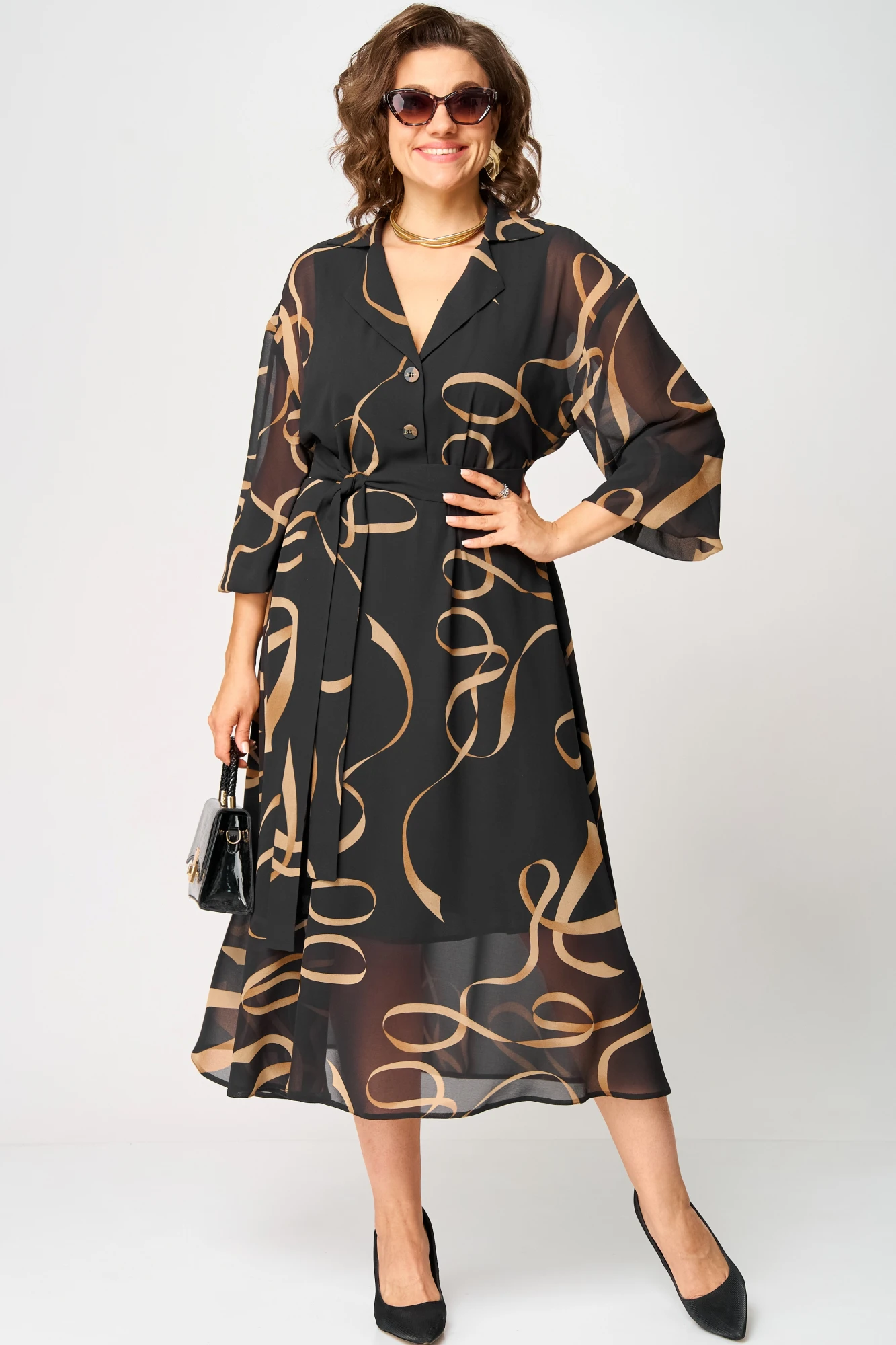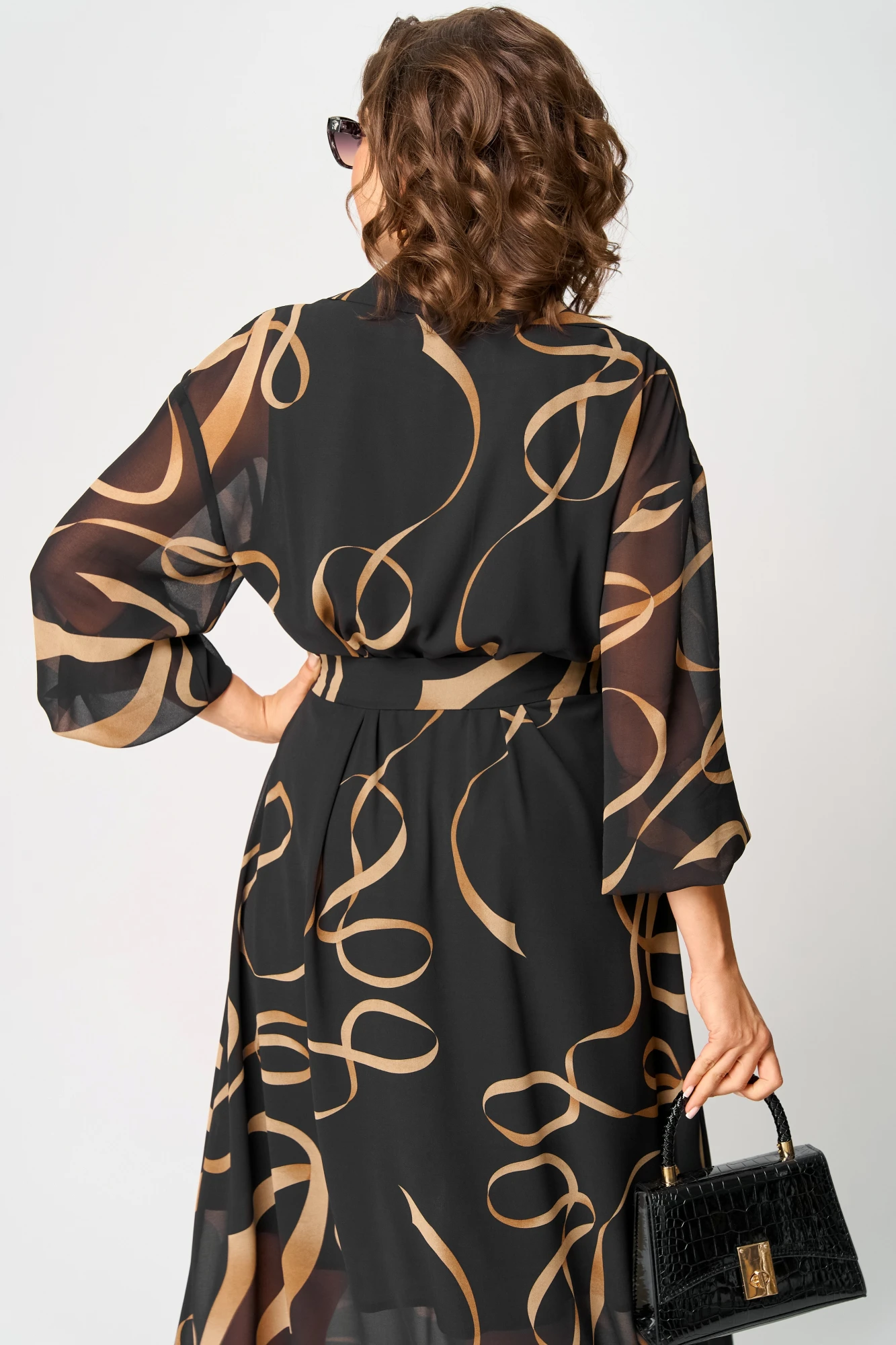 Платье женское нарядно-повседневное полуприлегающего силуэта до талии расширенное к низу. Плье отрезное по талии. Выполнено из креп-шифона. Вырез горловины отложной воротник с подбортами, до талии застежка на обметанные петли и пуговицы. Рукав втачной по низу собран на резинку. от талии юбка платья на трикотажной подкладке. Декором платья служит съемный пояс и принт самой ткани.