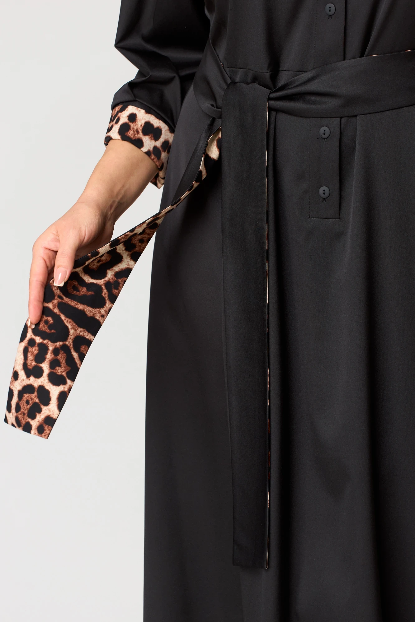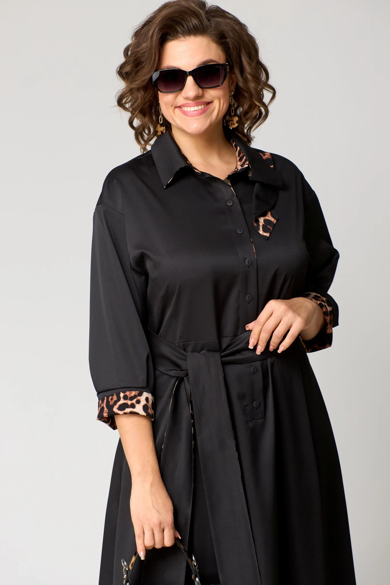 Платье женское нарядно-повседневное полуприлегающего силуэта расширенное к низу выполнено из плательной ткани в сочетании с отделкой с анималистичным принтом. Вырез горловины ассиметричный воротник на стойке рубашечного типа с левой сороны переходящий в отделочный элемент закрепленный на верхней части полочки. По центру застежка ниже талии на обметанные петли и пуговицы. Плечо спущенное, рукав втаной по низу со складками на притачной манжете. В боковых швах обработаны карманы. Декором служит съемный пояс с отделкой.