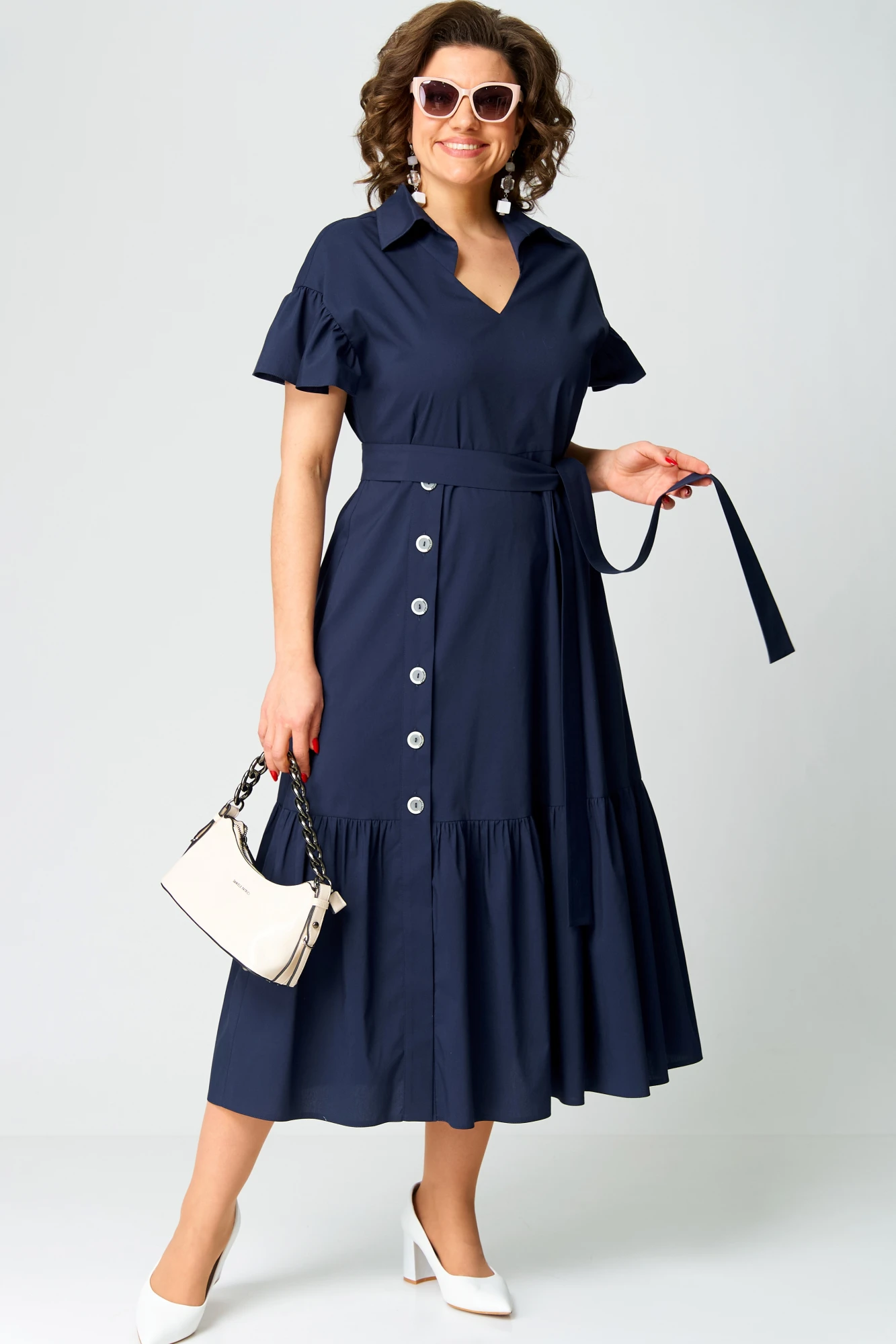 Платье женское нарядно-пвседневное полуприлегающего силуэта расширенное к низуу. Выполнено из хлопка.Вырез горловины фигурный, воротник на стойке рубашечного типа. Рукав спущенный по низу с воланом собранным на сборку. Платье отрезное по талии. Юбка ассиметричная с застежкой доверху на обметанные петли и пуговицы. По низу юбки притачной волан, в боковых швах обработаны карманы. Декором платья служит дизайн ткани, съемный пояс из основной ткани и отделочные пуговицы.