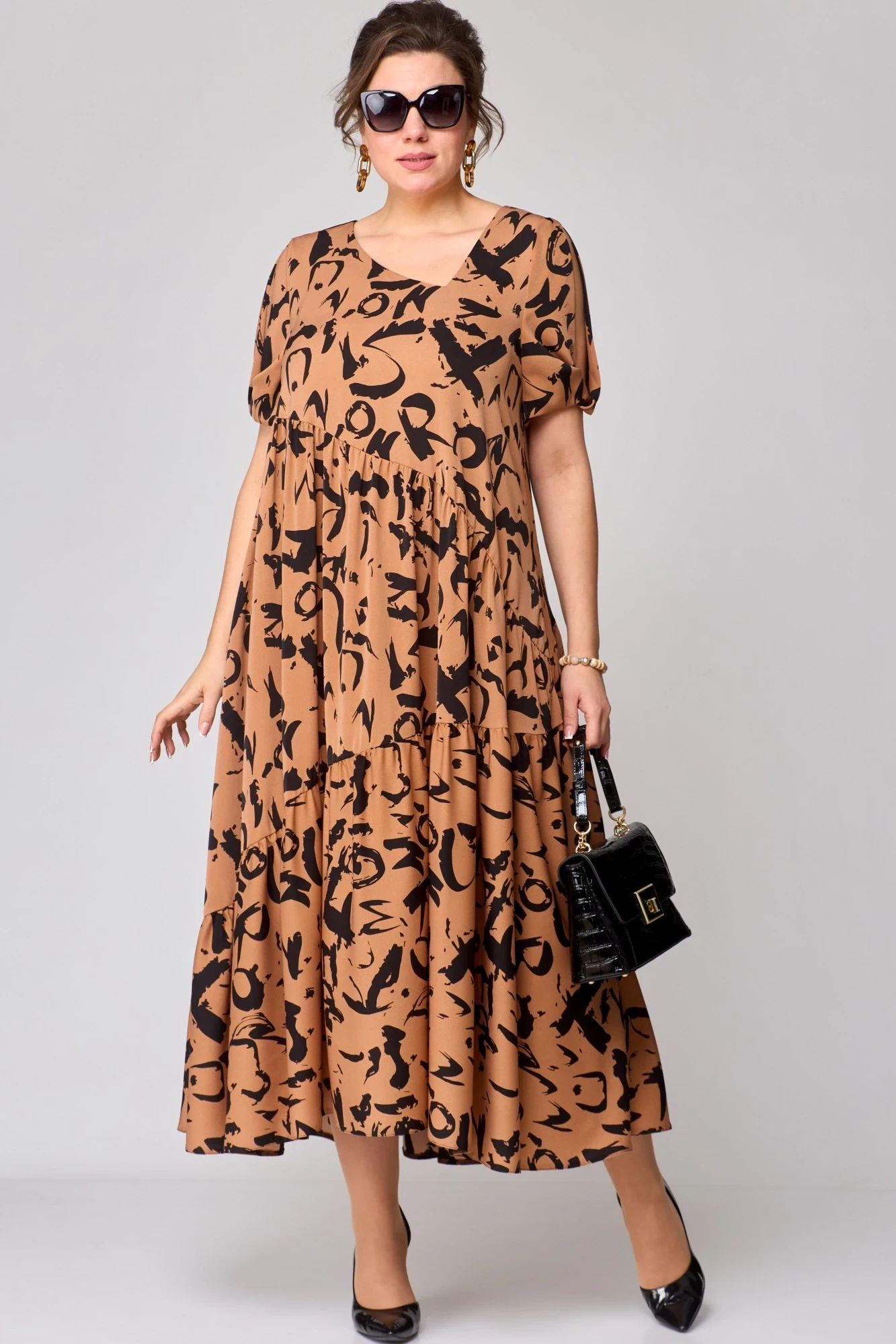 Платье женское наряно-повседненое свободного силуэта. Выполнено из плательной ткани. Вырез горловины фигурный, обрабоан отчкой, рукав втачной короткий с перекрутом по низу. По плочке и спинке платя ассиметричне подрезы со сборкой. В боковых швах обработаны карманы. По спинке платье чуть длинее чем по полочке. Декором платья служит дизайн самой ткани.