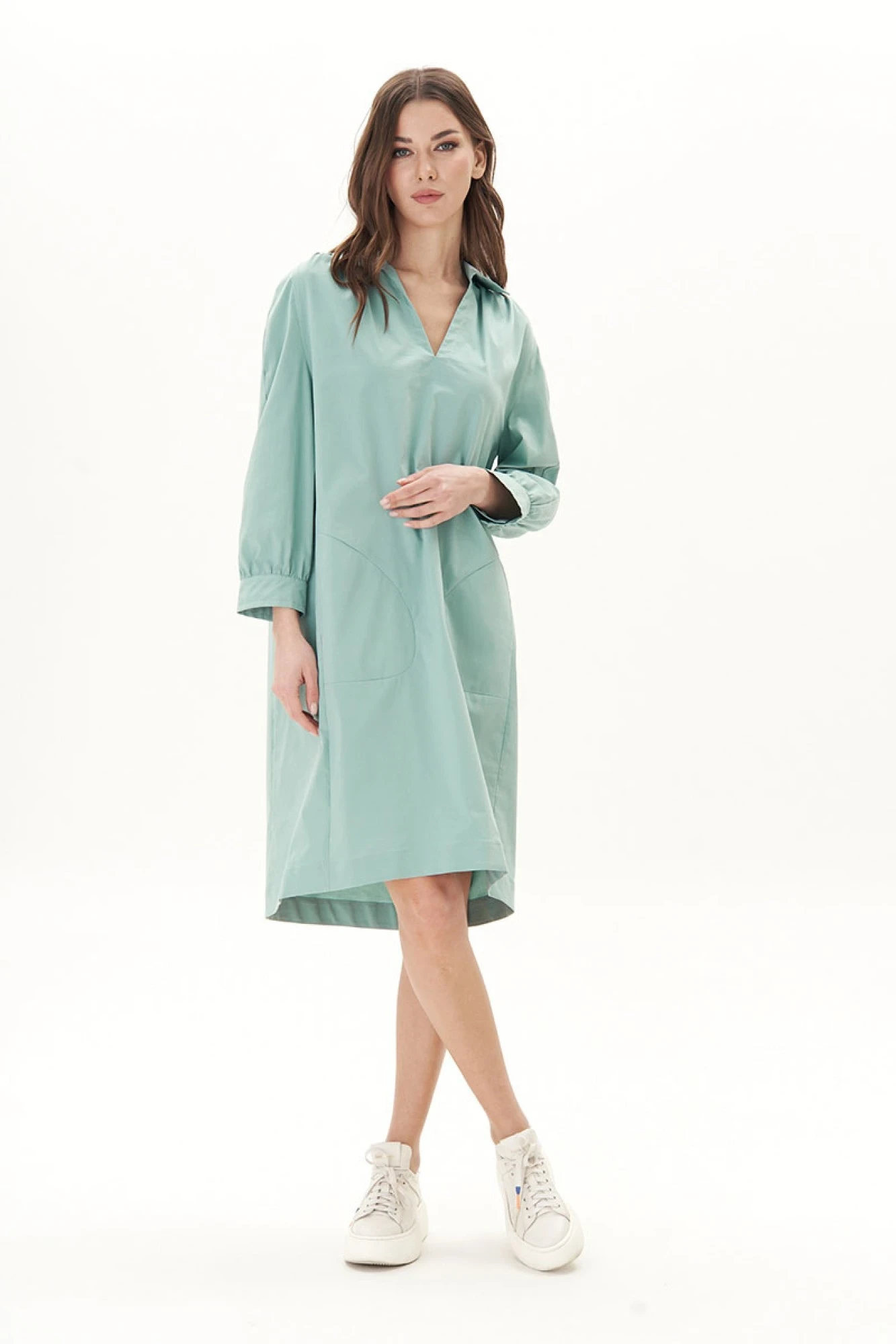 Рукав-полуреглан спереди и цельнокроенный на спинке. Рукав 3/4 на отрезной манжете. Линия низа - ассиметричная.