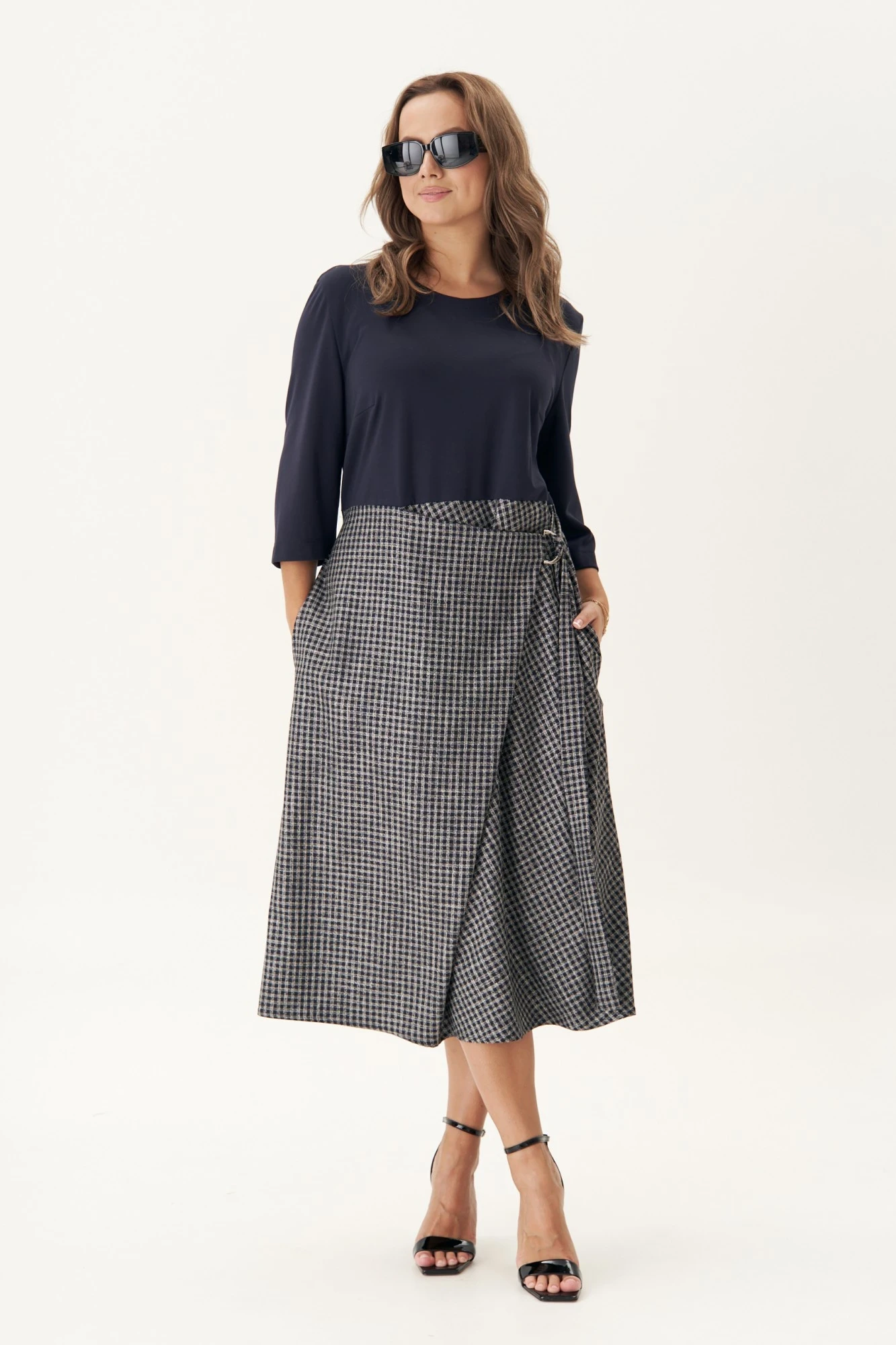 Платье свободного упрямленного силуэта с втачным рукавом 3/4. Полочка и спинка с отрезным лифом чуть выше линии талии. Плочка с нагрудной вытачкой, спинка с талиевой. Нижняя часть полочки с цельнокроенным запахом, переходящим в мягкую складку. Запах фиксируется поясом и патой с полукольцами.