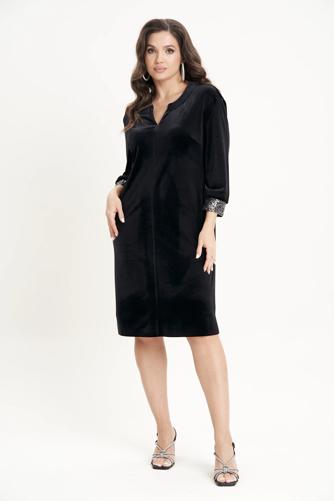 Платье остаётся неизменным символом женственности и элегантности, являясь ключевым элементом гардероба. Акцент - на многофункциональность! Это и самостоятельный наряд, и в дополнении с другими элементами одежды (жакеты) - гармоничный образ от вечернего выхода до повседневного. Свободный упрямлённый силуэт, втачной рукав, круглая горловина с акцентным треугольным вырезом. Спинка с центральным швом. Рукав 3/4 с акцентной деталью из пайеток.