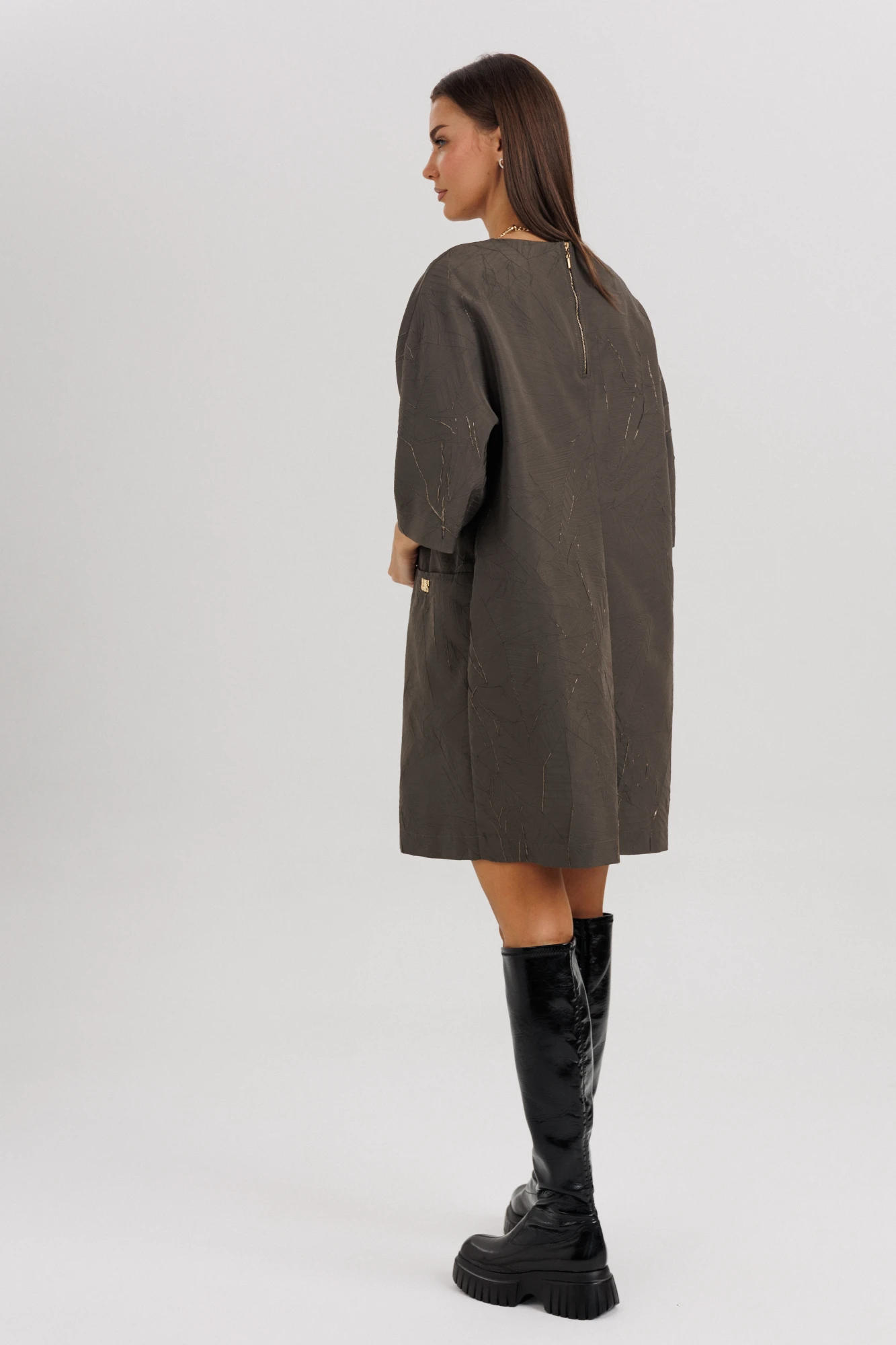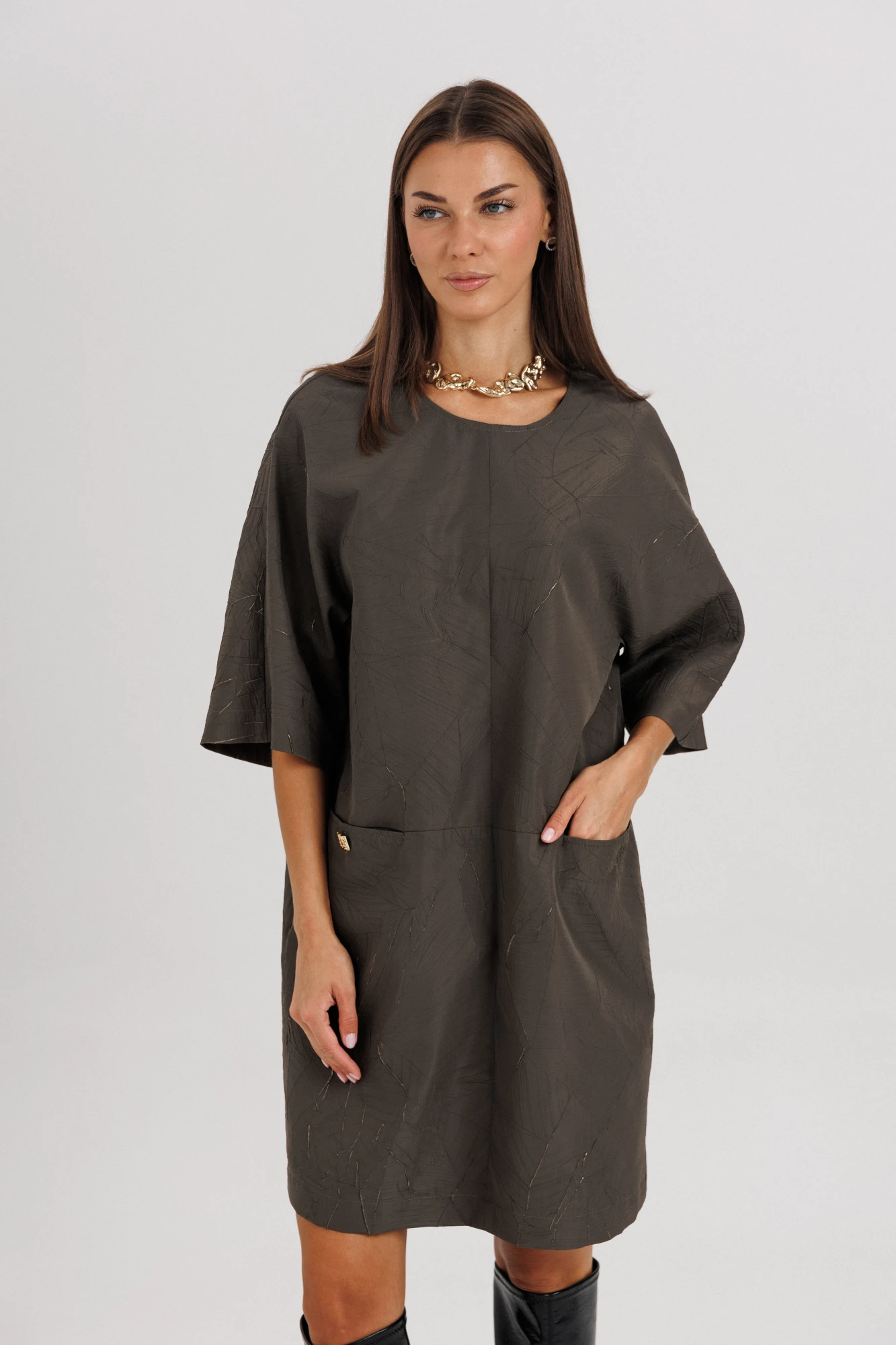 Платье имеет декоративные металлические элементы у линии карманов, что придает образу современный акцент. Универсальная длина до колена позволяет сочетать модель как с высокими сапогами, так и с ботильонами или обувью на плоской подошве.