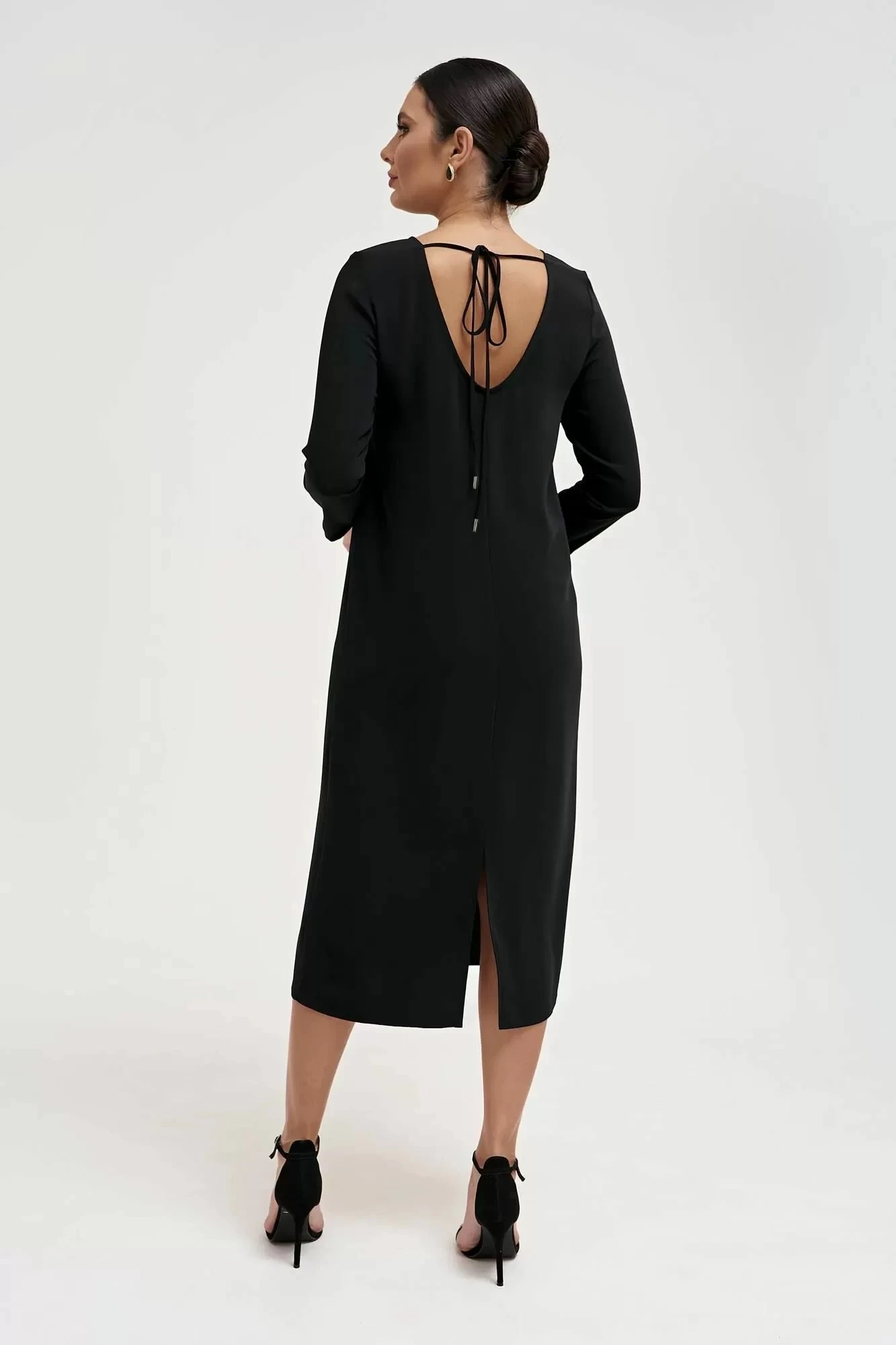 Женское платье свободного силуэта длины миди выполнено из легкой струящейся ткани со втачными рукавами и округлым вырезом горловины, по спинке - декоративный вырез и фиксирующие завязки, по низу - разрез.