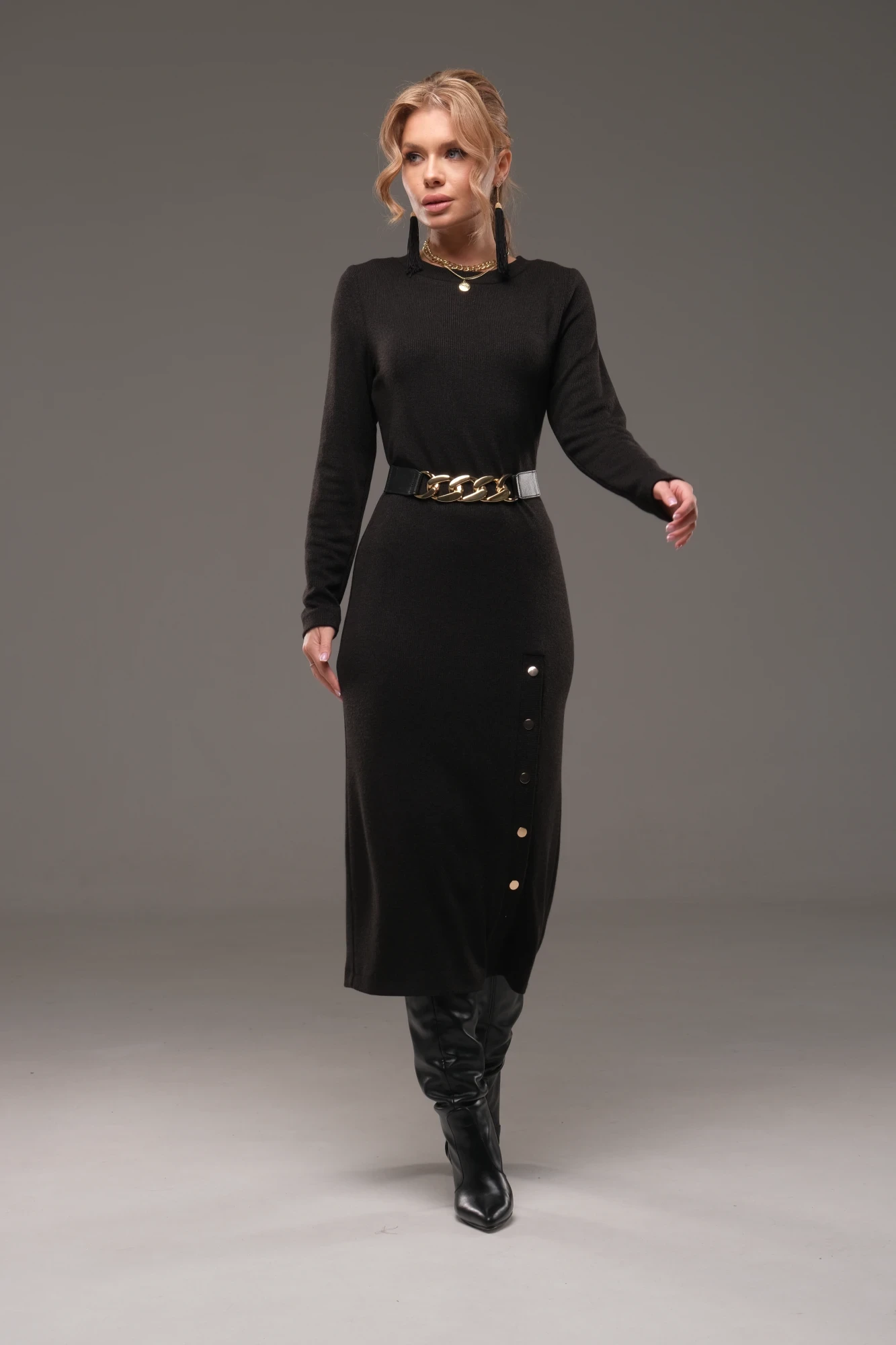 "Платье трикотажное, прилегающего силуэта со средним швом по спинке с ремнем .Спереди на левой половинкк обработана планка, которая застёгивается на пять кнопок.